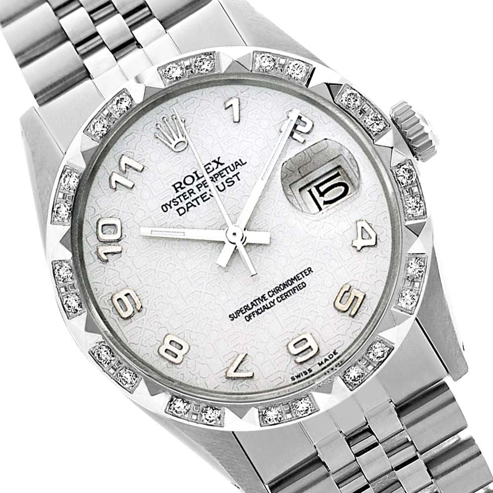 WATCH DETAILS: ITEM: WatchBRAND: RolexTYPE: Stainless SteelFEATURE: QuickSetMODEL: DateJustMADE: Swiss MadeGENDER: Men'sCONDITION: Pre-OwnedFUNCTION: DateDIAL COLOR: SilverHOUR MARKERS: Arabic BEZEL TYPE: Pyrimid Custom Made Diamond Bezel BEZEL STONE: Diamond G-VVS1 BEZEL MATERIAL: 18K GoldBRACELET TYPE: Jubilee BRACELET MATERIAL: Stainless SteelCLASP TYPE: Folding ClaspCLASP MATERIAL: Stainless SteelCASE STONE: CASE SIZE: 36mmCRYSTAL: Scratch Resistance Sapphire CrystalMOVEMENT: Automatic (Self Winding)CALIBER: 3035CROWN TYPE: Screw Down CrownWATER RESISTANCE: Waterproof to 10 ATM/100 meters/330 feetMODEL #: 16014SKU #: AMSJQS33We Buy/Sell/Trade Valuable watches, Please call us