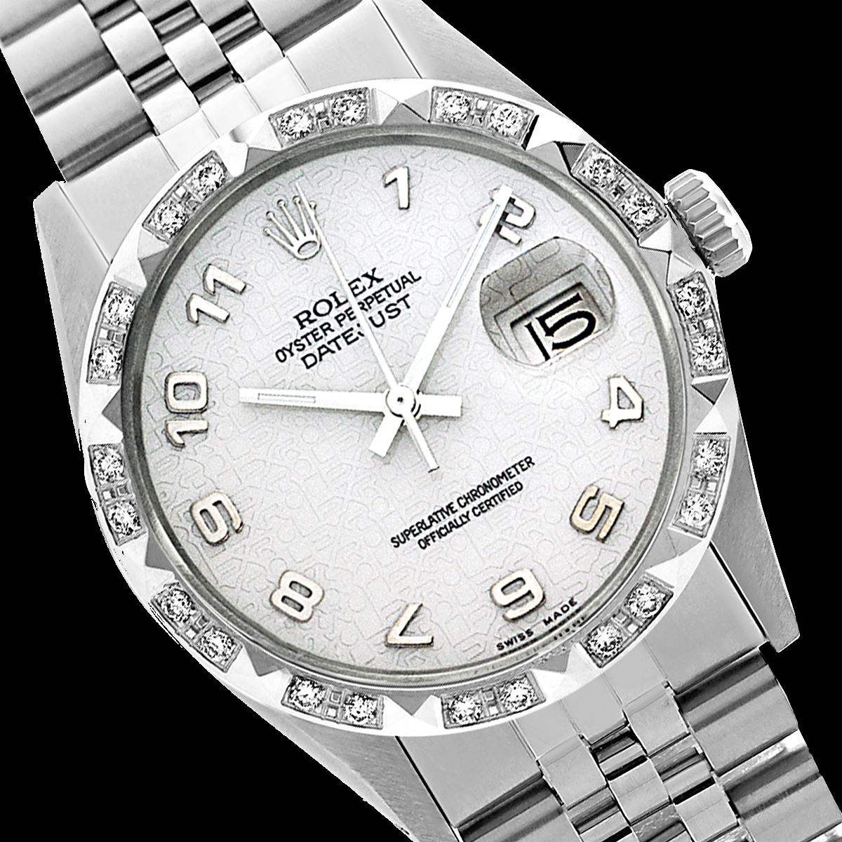 WATCH DETAILS: ITEM: WatchBRAND: RolexTYPE: Stainless SteelFEATURE: QuickSetMODEL: DateJustMADE: Swiss MadeGENDER: Men'sCONDITION: Pre-OwnedFUNCTION: DateDIAL COLOR: SilverHOUR MARKERS: Arabic BEZEL TYPE: Pyrimid Custom Made Diamond Bezel BEZEL STONE: Diamond G-VVS1 BEZEL MATERIAL: 18K GoldBRACELET TYPE: Jubilee BRACELET MATERIAL: Stainless SteelCLASP TYPE: Folding ClaspCLASP MATERIAL: Stainless SteelCASE STONE: CASE SIZE: 36mmCRYSTAL: Scratch Resistance Sapphire CrystalMOVEMENT: Automatic (Self Winding)CALIBER: 3035CROWN TYPE: Screw Down CrownWATER RESISTANCE: Waterproof to 10 ATM/100 meters/330 feetMODEL #: 16014SKU #: AMSJQS33We Buy/Sell/Trade Valuable watches, Please call us