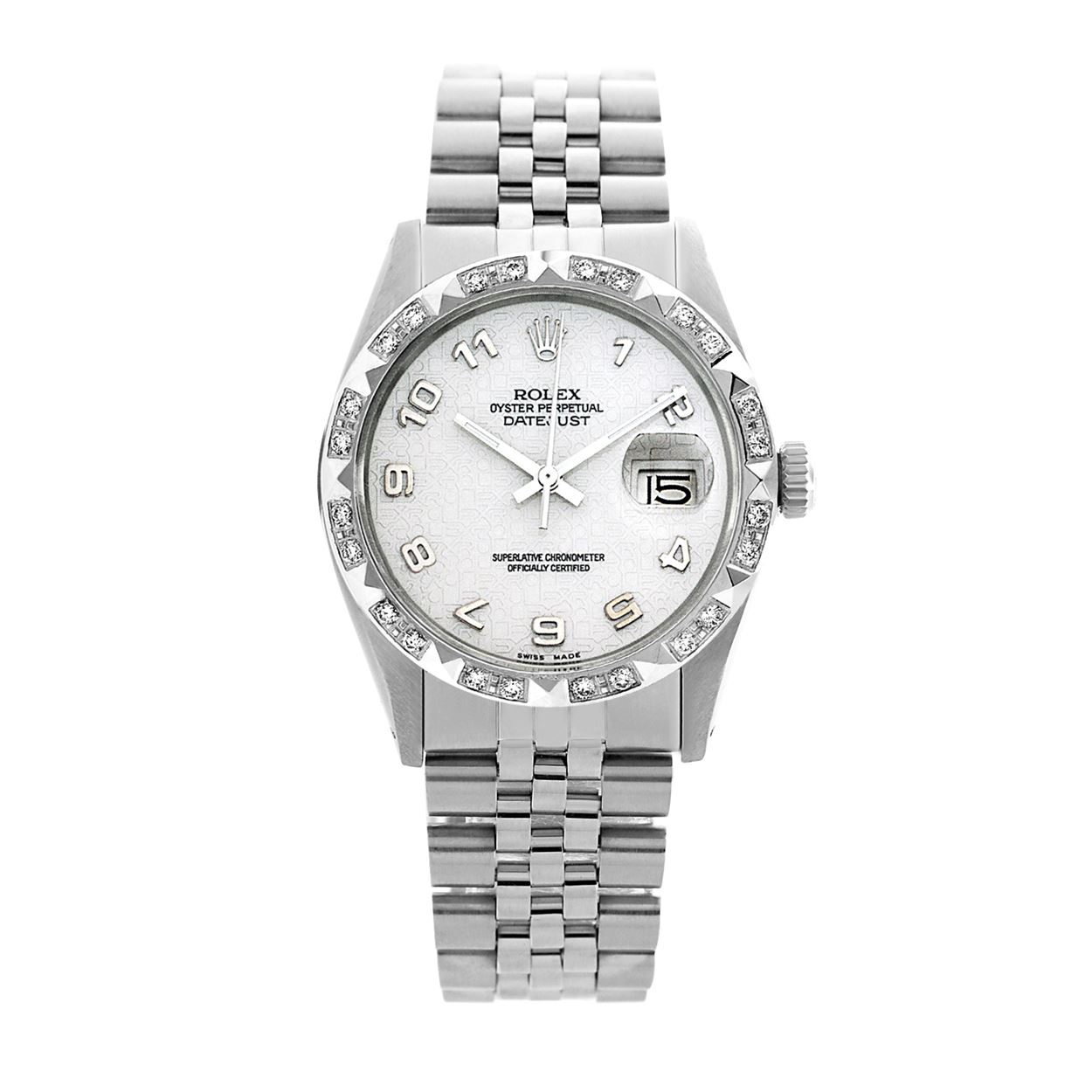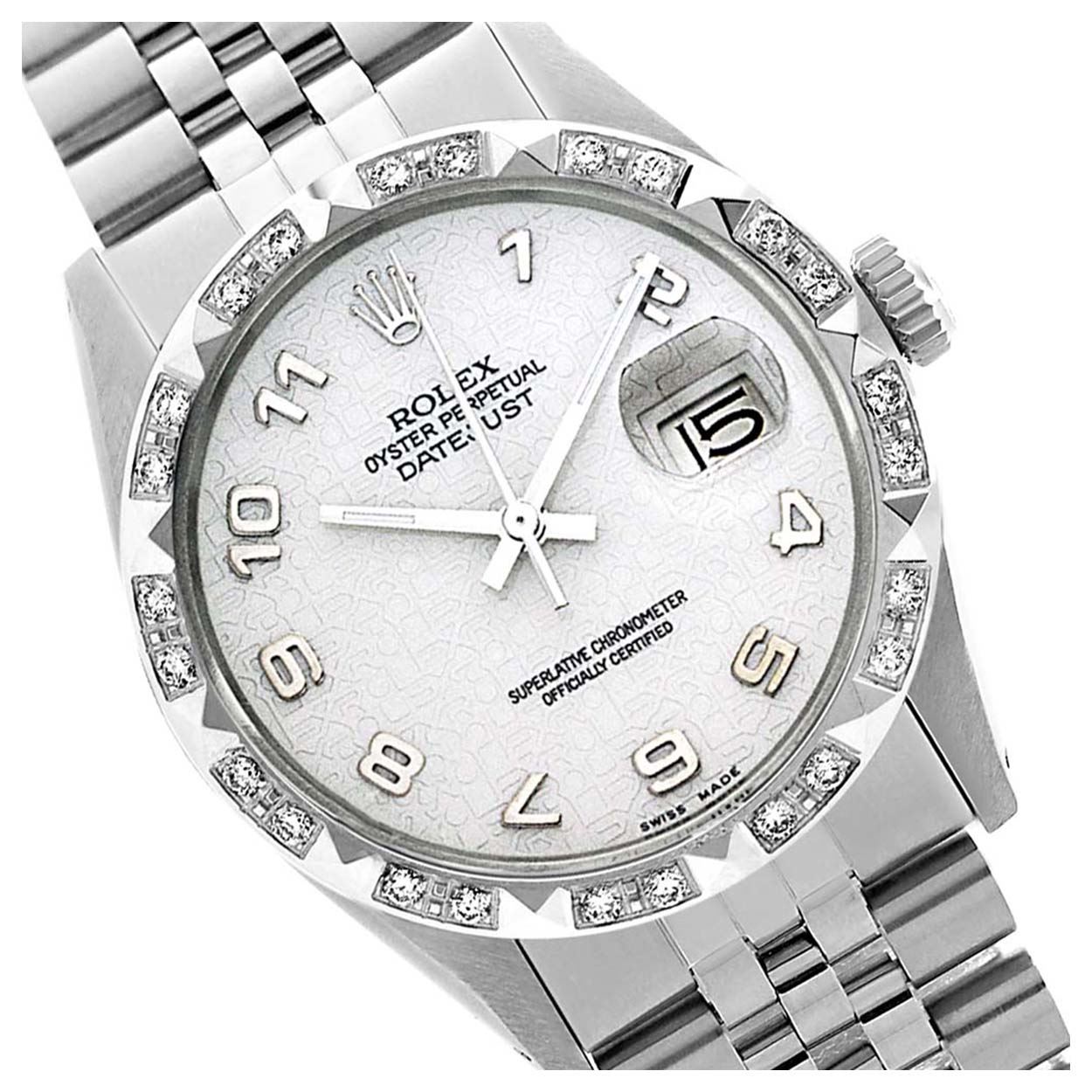 WATCH DETAILS: ITEM: WatchBRAND: RolexTYPE: Stainless SteelFEATURE: QuickSetMODEL: DateJustMADE: Swiss MadeGENDER: Men'sCONDITION: Pre-OwnedFUNCTION: DateDIAL COLOR: SilverHOUR MARKERS: Arabic BEZEL TYPE: Pyrimid Custom Made Diamond Bezel BEZEL STONE: Diamond G-VVS1 BEZEL MATERIAL: 18K GoldBRACELET TYPE: Jubilee BRACELET MATERIAL: Stainless SteelCLASP TYPE: Folding ClaspCLASP MATERIAL: Stainless SteelCASE STONE: CASE SIZE: 36mmCRYSTAL: Scratch Resistance Sapphire CrystalMOVEMENT: Automatic (Self Winding)CALIBER: 3035CROWN TYPE: Screw Down CrownWATER RESISTANCE: Waterproof to 10 ATM/100 meters/330 feetMODEL #: 16014SKU #: AMSJQS33We Buy/Sell/Trade Valuable watches, Please call us