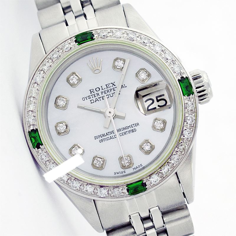 WATCH DETAILS: ITEM: WatchBRAND: RolexTYPE: Stainless SteelFEATURE: QuickSetMODEL: DateJustMADE: Swiss MadeGENDER: Men'sCONDITION: Pre-OwnedFUNCTION: DateDIAL COLOR: whiteHOUR MARKERS: 10 Round Custom Made DiamondBEZEL TYPE: Custom Made Diamond & Emerald BezelBEZEL STONE: Diamond 1 CTW G-VVS1 & 4 Colombian EmeraldBEZEL MATERIAL: 18K GoldBRACELET TYPE: Jubilee BRACELET MATERIAL: Stainless SteelCLASP TYPE: Folding ClaspCLASP MATERIAL: Stainless SteelCASE STONE: CASE SIZE: 36mmCRYSTAL: Scratch Resistance Sapphire CrystalMOVEMENT: Automatic (Self Winding)CALIBER: 3035CROWN TYPE: Screw Down CrownWATER RESISTANCE: Waterproof to 10 ATM/100 meters/330 feetMODEL #: 16014SKU #: AMSJQS165We Buy/Sell/Trade Valuable watches, Please call us