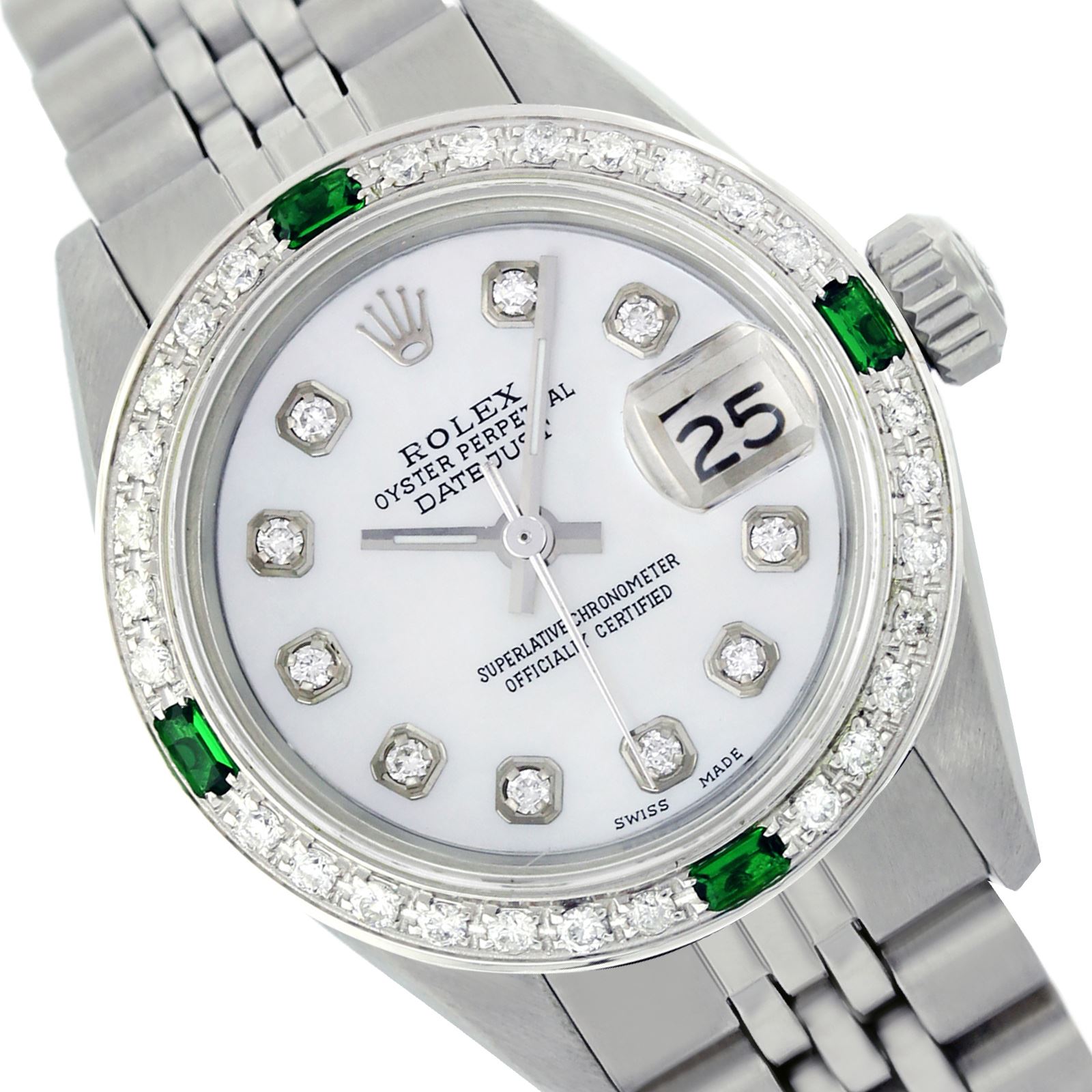 WATCH DETAILS: ITEM: WatchBRAND: RolexTYPE: Stainless SteelFEATURE: QuickSetMODEL: DateJustMADE: Swiss MadeGENDER: Men'sCONDITION: Pre-OwnedFUNCTION: DateDIAL COLOR: White Mother Of PearlHOUR MARKERS: 10 Round Custom Made DiamondBEZEL TYPE: Custom Made Diamond & Emerald BezelBEZEL STONE: Diamond 1 CTW G-VVS1 & 4 Colombian EmeraldBEZEL MATERIAL: 18K GoldBRACELET TYPE: Jubilee BRACELET MATERIAL: Stainless SteelCLASP TYPE: Folding ClaspCLASP MATERIAL: Stainless SteelCASE STONE: CASE SIZE: 36mmCRYSTAL: Scratch Resistance Sapphire CrystalMOVEMENT: Automatic (Self Winding)CALIBER: 3035CROWN TYPE: Screw Down CrownWATER RESISTANCE: Waterproof to 10 ATM/100 meters/330 feetMODEL #: 16014SKU #: AMSJQS65We Buy/Sell/Trade Valuable watches, Please call us