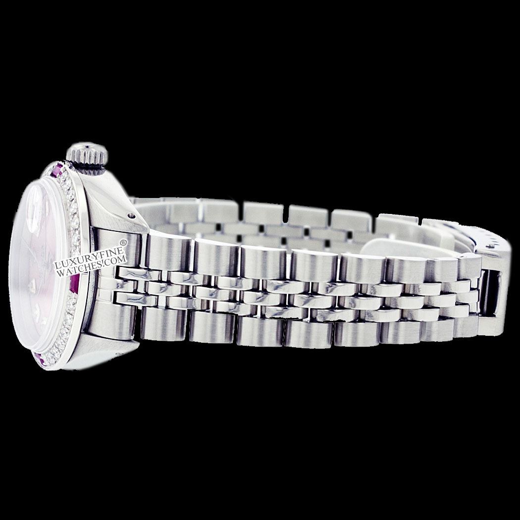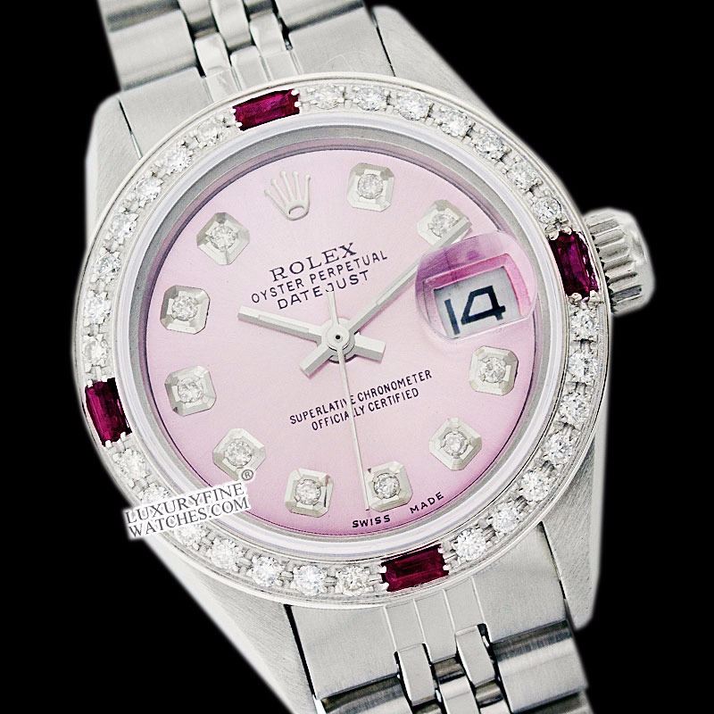 WATCH DETAILS: ITEM: WatchBRAND: RolexTYPE: Stainless SteelFEATURE: QuickSetMODEL: DateJustMADE: Swiss MadeGENDER: Men'sCONDITION: Pre-OwnedFUNCTION: DateDIAL COLOR: PinkHOUR MARKERS: 10 Round DiamondBEZEL TYPE: Diamond & Ruby BezelBEZEL STONE: Diamond 1 CTW G-VVS1 & 4 Burmise RubyBEZEL MATERIAL: 18K GoldBRACELET TYPE: Jubilee BRACELET MATERIAL: Stainless SteelCLASP TYPE: Folding ClaspCLASP MATERIAL: Stainless SteelCASE STONE: CASE SIZE: 36mmCRYSTAL: Scratch Resistance Sapphire CrystalMOVEMENT: Automatic (Self Winding)CALIBER: 3035CROWN TYPE: Screw Down CrownWATER RESISTANCE: Waterproof to 10 ATM/100 meters/330 feetMODEL #: 16014SKU #: AMSJQS166We Buy/Sell/Trade Valuable watches, Please call usNote: Presentational generic box included. This watch was professionally inspected and serviced prior to auction. We are not affiliated with Rolex USA, Inc.