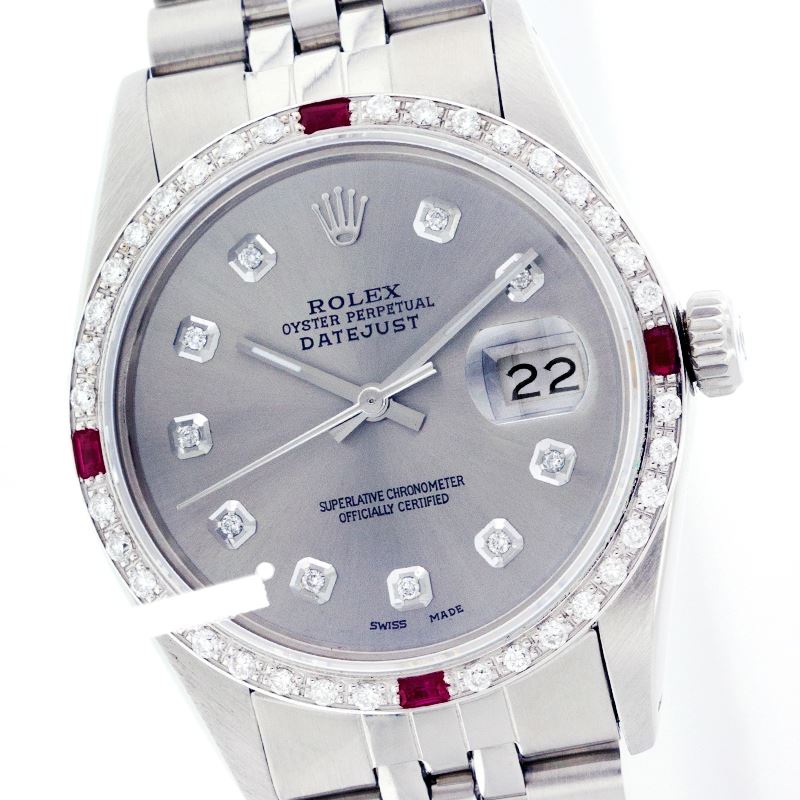 WATCH DETAILS: ITEM: WatchBRAND: RolexTYPE: Stainless SteelFEATURE: QuickSetMODEL: DateJustMADE: Swiss MadeGENDER: Men'sCONDITION: Pre-OwnedFUNCTION: DateDIAL COLOR: GreyHOUR MARKERS: 10 Round Custom Made DiamondBEZEL TYPE: Custom Made Diamond & Ruby BezelBEZEL STONE: Diamond 1 CTW G-VVS1 & 4 Burmise RubyBEZEL MATERIAL: 18K GoldBRACELET TYPE: Jubilee BRACELET MATERIAL: Stainless SteelCLASP TYPE: Folding ClaspCLASP MATERIAL: Stainless SteelCASE STONE: CASE SIZE: 36mmCRYSTAL: Scratch Resistance Sapphire CrystalMOVEMENT: Automatic (Self Winding)CALIBER: 3035CROWN TYPE: Screw Down CrownWATER RESISTANCE: Waterproof to 10 ATM/100 meters/330 feetMODEL #: 16014SKU #: AMSJQS126We Buy/Sell/Trade Valuable watches, Please call us