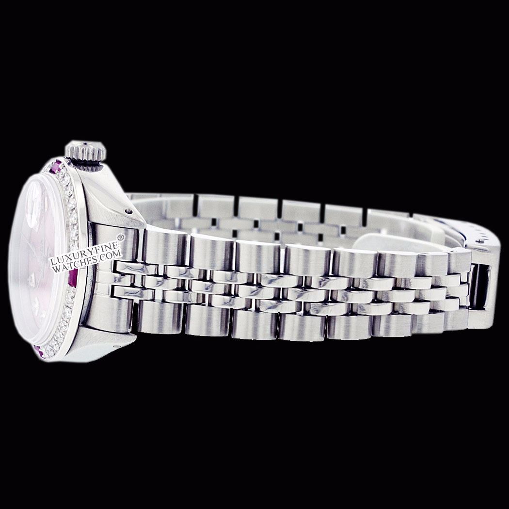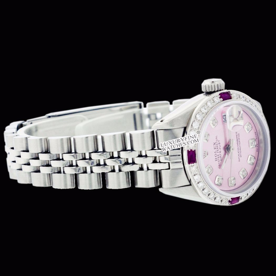 WATCH DETAILS: ITEM: WatchBRAND: RolexTYPE: Stainless SteelFEATURE: QuickSetMODEL: DateJustMADE: Swiss MadeGENDER: Men'sCONDITION: Pre-OwnedFUNCTION: DateDIAL COLOR: Pink Mother Of PearlHOUR MARKERS: 10 Round DiamondBEZEL TYPE: Diamond & Ruby BezelBEZEL STONE: Diamond 1 CTW G-VVS1 & 4 Burmise RubyBEZEL MATERIAL: 18K GoldBRACELET TYPE: Jubilee BRACELET MATERIAL: Stainless SteelCLASP TYPE: Folding ClaspCLASP MATERIAL: Stainless SteelCASE STONE: CASE SIZE: 36mmCRYSTAL: Scratch Resistance Sapphire CrystalMOVEMENT: Automatic (Self Winding)CALIBER: 3035CROWN TYPE: Screw Down CrownWATER RESISTANCE: Waterproof to 10 ATM/100 meters/330 feetMODEL #: 16014SKU #: AMSJQS66We Buy/Sell/Trade Valuable watches, Please call usNote: Presentational generic box included. This watch was professionally inspected and serviced prior to auction. We are not affiliated with Rolex USA, Inc.