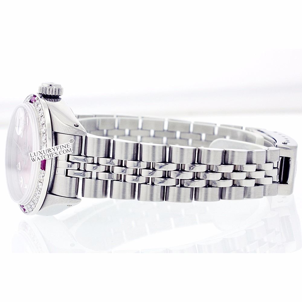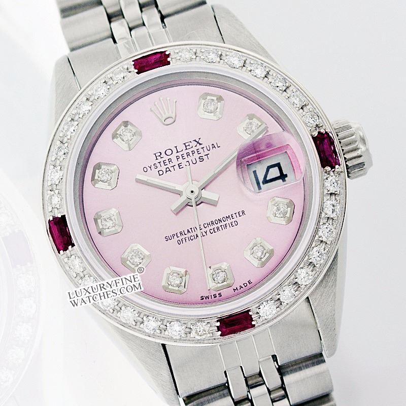 WATCH DETAILS: ITEM: WatchBRAND: RolexTYPE: Stainless SteelFEATURE: QuickSetMODEL: DateJustMADE: Swiss MadeGENDER: Men'sCONDITION: Pre-OwnedFUNCTION: DateDIAL COLOR: Pink Mother Of PearlHOUR MARKERS: 10 Round DiamondBEZEL TYPE: Diamond & Ruby BezelBEZEL STONE: Diamond 1 CTW G-VVS1 & 4 Burmise RubyBEZEL MATERIAL: 18K GoldBRACELET TYPE: Jubilee BRACELET MATERIAL: Stainless SteelCLASP TYPE: Folding ClaspCLASP MATERIAL: Stainless SteelCASE STONE: CASE SIZE: 36mmCRYSTAL: Scratch Resistance Sapphire CrystalMOVEMENT: Automatic (Self Winding)CALIBER: 3035CROWN TYPE: Screw Down CrownWATER RESISTANCE: Waterproof to 10 ATM/100 meters/330 feetMODEL #: 16014SKU #: AMSJQS66We Buy/Sell/Trade Valuable watches, Please call usNote: Presentational generic box included. This watch was professionally inspected and serviced prior to auction. We are not affiliated with Rolex USA, Inc.