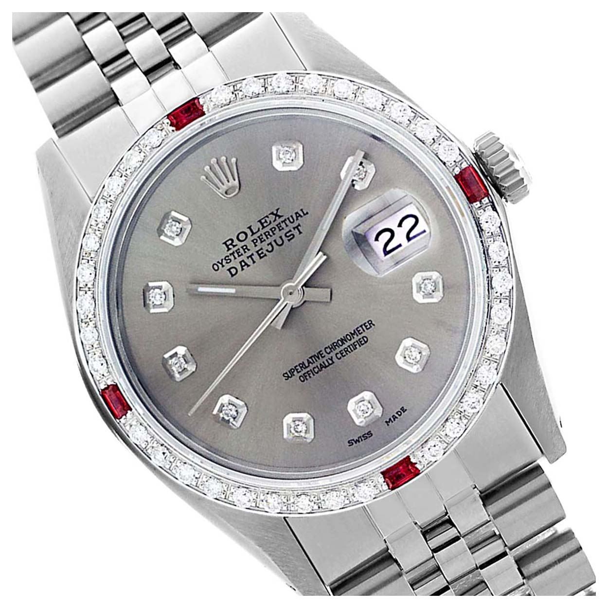 WATCH DETAILS: ITEM: WatchBRAND: RolexTYPE: Stainless SteelFEATURE: QuickSetMODEL: DateJustMADE: Swiss MadeGENDER: Men'sCONDITION: Pre-OwnedFUNCTION: DateDIAL COLOR: GreyHOUR MARKERS: 10 Round Custom Made DiamondBEZEL TYPE: Custom Made Diamond & Ruby BezelBEZEL STONE: Diamond 1 CTW G-VVS1 & 4 Burmise RubyBEZEL MATERIAL: 18K GoldBRACELET TYPE: Jubilee BRACELET MATERIAL: Stainless SteelCLASP TYPE: Folding ClaspCLASP MATERIAL: Stainless SteelCASE STONE: CASE SIZE: 36mmCRYSTAL: Scratch Resistance Sapphire CrystalMOVEMENT: Automatic (Self Winding)CALIBER: 3035CROWN TYPE: Screw Down CrownWATER RESISTANCE: Waterproof to 10 ATM/100 meters/330 feetMODEL #: 16014SKU #: AMSJQS26We Buy/Sell/Trade Valuable watches, Please call us
