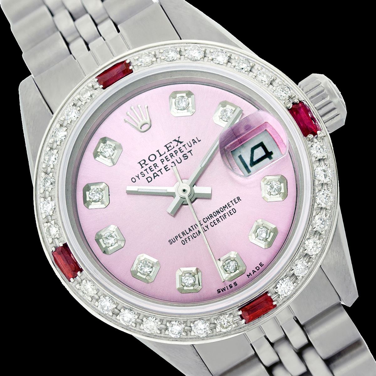 WATCH DETAILS: ITEM: WatchBRAND: RolexTYPE: Stainless SteelFEATURE: QuickSetMODEL: DateJustMADE: Swiss MadeGENDER: Men'sCONDITION: Pre-OwnedFUNCTION: DateDIAL COLOR: Pink Mother Of PearlHOUR MARKERS: 10 Round Custom Made DiamondBEZEL TYPE: Custom Made Diamond & Ruby BezelBEZEL STONE: Diamond 1 CTW G-VVS1 & 4 Burmise RubyBEZEL MATERIAL: 18K GoldBRACELET TYPE: Jubilee BRACELET MATERIAL: Stainless SteelCLASP TYPE: Folding ClaspCLASP MATERIAL: Stainless SteelCASE STONE: CASE SIZE: 36mmCRYSTAL: Scratch Resistance Sapphire CrystalMOVEMENT: Automatic (Self Winding)CALIBER: 3035CROWN TYPE: Screw Down CrownWATER RESISTANCE: Waterproof to 10 ATM/100 meters/330 feetMODEL #: 16014SKU #: AMSJQS66We Buy/Sell/Trade Valuable watches, Please call us