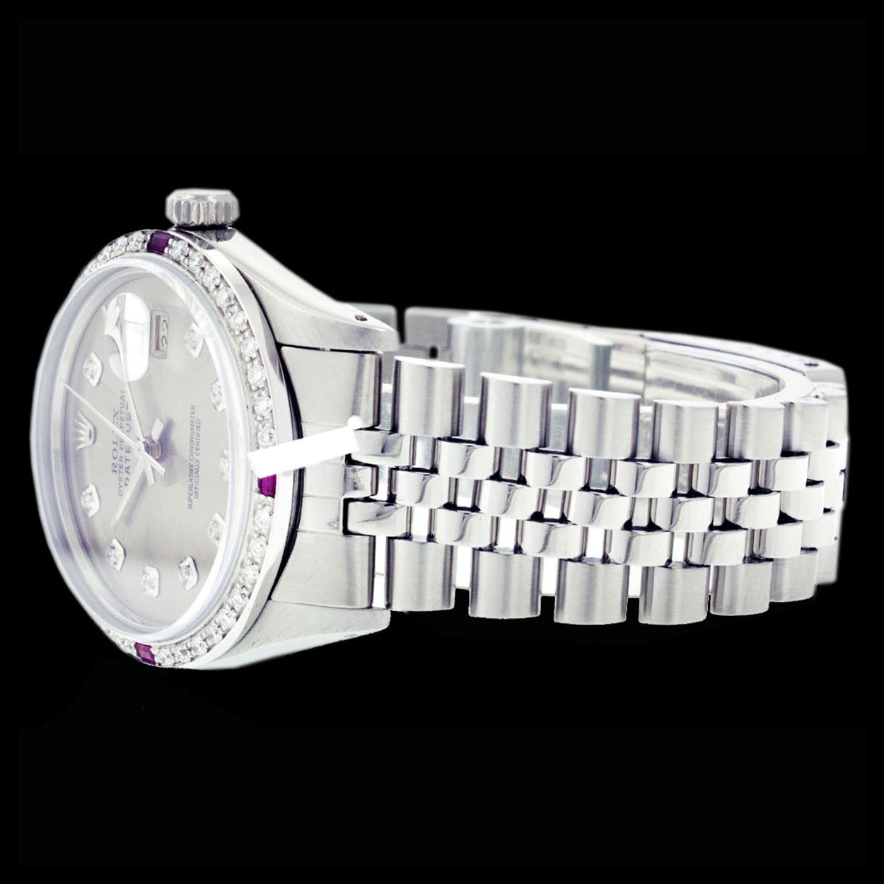 WATCH DETAILS: ITEM: WatchBRAND: RolexTYPE: Stainless SteelFEATURE: QuickSetMODEL: DateJustMADE: Swiss MadeGENDER: Men'sCONDITION: Pre-OwnedFUNCTION: DateDIAL COLOR: GreyHOUR MARKERS: 10 Round Custom Made DiamondBEZEL TYPE: Custom Made Diamond & Ruby BezelBEZEL STONE: Diamond 1 CTW G-VVS1 & 4 Burmise RubyBEZEL MATERIAL: 18K GoldBRACELET TYPE: Jubilee BRACELET MATERIAL: Stainless SteelCLASP TYPE: Folding ClaspCLASP MATERIAL: Stainless SteelCASE STONE: CASE SIZE: 36mmCRYSTAL: Scratch Resistance Sapphire CrystalMOVEMENT: Automatic (Self Winding)CALIBER: 3035CROWN TYPE: Screw Down CrownWATER RESISTANCE: Waterproof to 10 ATM/100 meters/330 feetMODEL #: 16014SKU #: AMSJQS126We Buy/Sell/Trade Valuable watches, Please call us