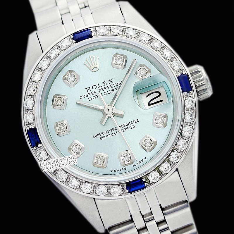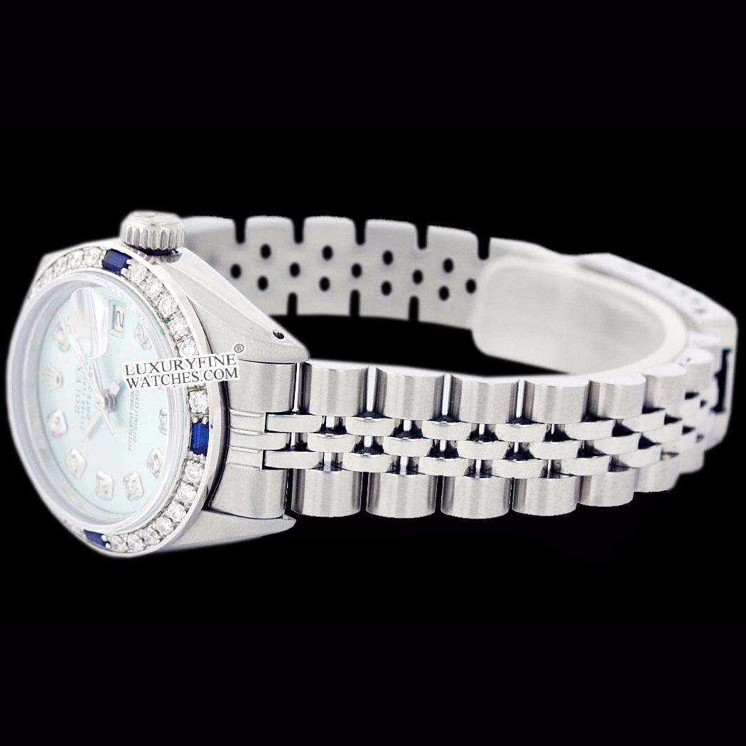 WATCH DETAILS: ITEM: WatchBRAND: RolexTYPE: Stainless SteelFEATURE: QuickSetMODEL: DateJustMADE: Swiss MadeGENDER: Men'sCONDITION: Pre-OwnedFUNCTION: DateDIAL COLOR: Dark Ice BlueHOUR MARKERS: 10 Round DiamondBEZEL TYPE: Diamond & Sapphire BezelBEZEL STONE: Diamond 1 CTW G-VVS1 & Ceylon Blue SapphireBEZEL MATERIAL: 18K GoldBRACELET TYPE: Jubilee BRACELET MATERIAL: Stainless SteelCLASP TYPE: Folding ClaspCLASP MATERIAL: Stainless SteelCASE STONE: CASE SIZE: 36mmCRYSTAL: Scratch Resistance Sapphire CrystalMOVEMENT: Automatic (Self Winding)CALIBER: 3035CROWN TYPE: Screw Down CrownWATER RESISTANCE: Waterproof to 10 ATM/100 meters/330 feetMODEL #: 16014SKU #: AMSJQS90We Buy/Sell/Trade Valuable watches, Please call usNote: Presentational generic box included. This watch was professionally inspected and serviced prior to auction. We are not affiliated with Rolex USA, Inc.