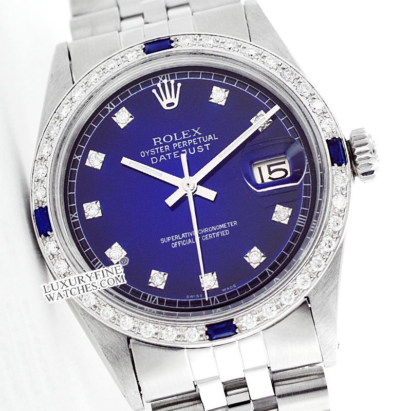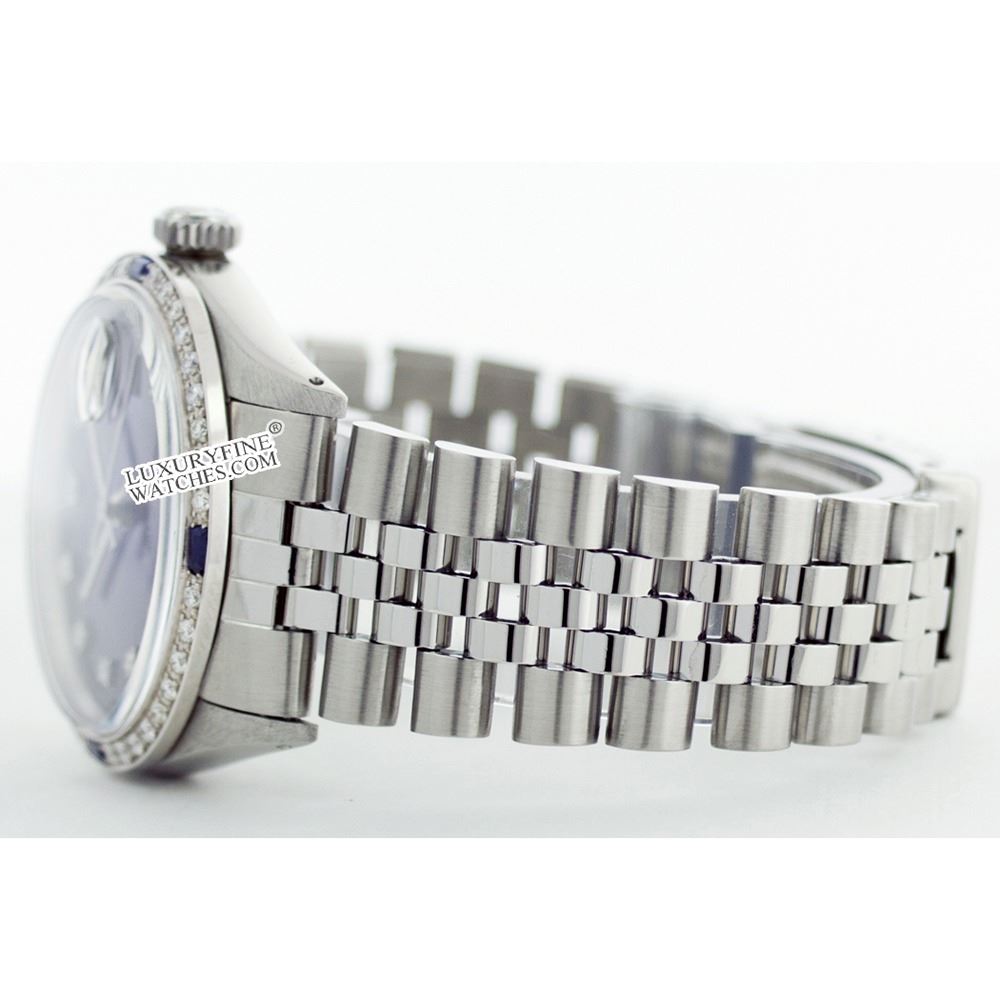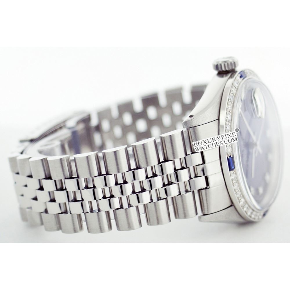 WATCH DETAILS: ITEM: WatchBRAND: RolexTYPE: Stainless SteelFEATURE: QuickSetMODEL: DateJustMADE: Swiss MadeGENDER: Men'sCONDITION: Pre-OwnedFUNCTION: DateDIAL COLOR: BlueHOUR MARKERS: 10 Round DiamondBEZEL TYPE: Diamond & Sapphire BezelBEZEL STONE: Diamond 1 CTW G-VVS1 & Ceylon Blue SapphireBEZEL MATERIAL: 18K GoldBRACELET TYPE: Jubilee BRACELET MATERIAL: Stainless SteelCLASP TYPE: Folding ClaspCLASP MATERIAL: Stainless SteelCASE STONE: CASE SIZE: 36mmCRYSTAL: Scratch Resistance Sapphire CrystalMOVEMENT: Automatic (Self Winding)CALIBER: 3035CROWN TYPE: Screw Down CrownWATER RESISTANCE: Waterproof to 10 ATM/100 meters/330 feetMODEL #: 16014SKU #: AMSJQS30We Buy/Sell/Trade Valuable watches, Please call usNote: Presentational generic box included. This watch was professionally inspected and serviced prior to auction. We are not affiliated with Rolex USA, Inc.