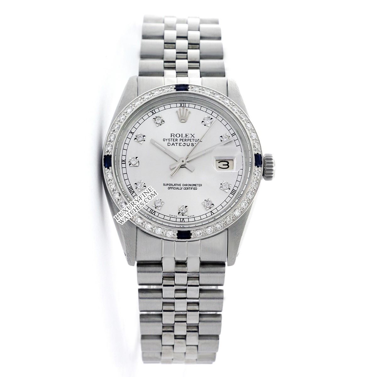 WATCH DETAILS: ITEM: WatchBRAND: RolexTYPE: Stainless SteelFEATURE: QuickSetMODEL: DateJustMADE: Swiss MadeGENDER: Men'sCONDITION: Pre-OwnedFUNCTION: DateDIAL COLOR: SilverHOUR MARKERS: 10 Round DiamondBEZEL TYPE: Diamond & Sapphire BezelBEZEL STONE: Diamond 1 CTW G-VVS1 & Ceylon Blue SapphireBEZEL MATERIAL: 18K GoldBRACELET TYPE: Jubilee BRACELET MATERIAL: Stainless SteelCLASP TYPE: Folding ClaspCLASP MATERIAL: Stainless SteelCASE STONE: CASE SIZE: 36mmCRYSTAL: Scratch Resistance Sapphire CrystalMOVEMENT: Automatic (Self Winding)CALIBER: 3035CROWN TYPE: Screw Down CrownWATER RESISTANCE: Waterproof to 10 ATM/100 meters/330 feetMODEL #: 16014SKU #: AMSJQS31We Buy/Sell/Trade Valuable watches, Please call usNote: Presentational generic box included. This watch was professionally inspected and serviced prior to auction. We are not affiliated with Rolex USA, Inc.