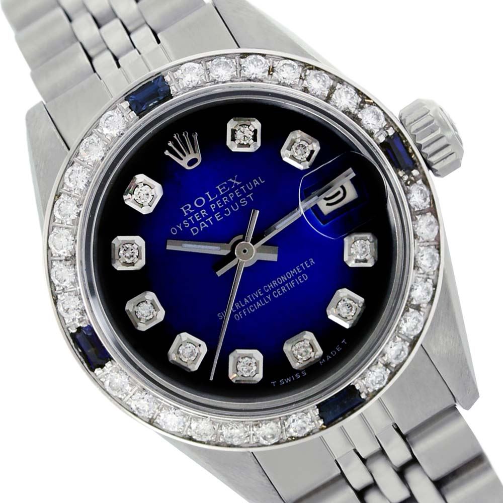 WATCH DETAILS: ITEM: WatchBRAND: RolexTYPE: Stainless SteelFEATURE: QuickSetMODEL: DateJustMADE: Swiss MadeGENDER: Men'sCONDITION: Pre-OwnedFUNCTION: DateDIAL COLOR: Blue Vignette HOUR MARKERS: 10 Round Custom Made DiamondBEZEL TYPE: Custom Made Diamond & Sapphire BezelBEZEL STONE: Diamond 1 CTW G-VVS1 & Ceylon Blue SapphireBEZEL MATERIAL: 18K GoldBRACELET TYPE: Jubilee BRACELET MATERIAL: Stainless SteelCLASP TYPE: Folding ClaspCLASP MATERIAL: Stainless SteelCASE STONE: CASE SIZE: 36mmCRYSTAL: Scratch Resistance Sapphire CrystalMOVEMENT: Automatic (Self Winding)CALIBER: 3035CROWN TYPE: Screw Down CrownWATER RESISTANCE: Waterproof to 10 ATM/100 meters/330 feetMODEL #: 16014SKU #: AMSJQS51We Buy/Sell/Trade Valuable watches, Please call us