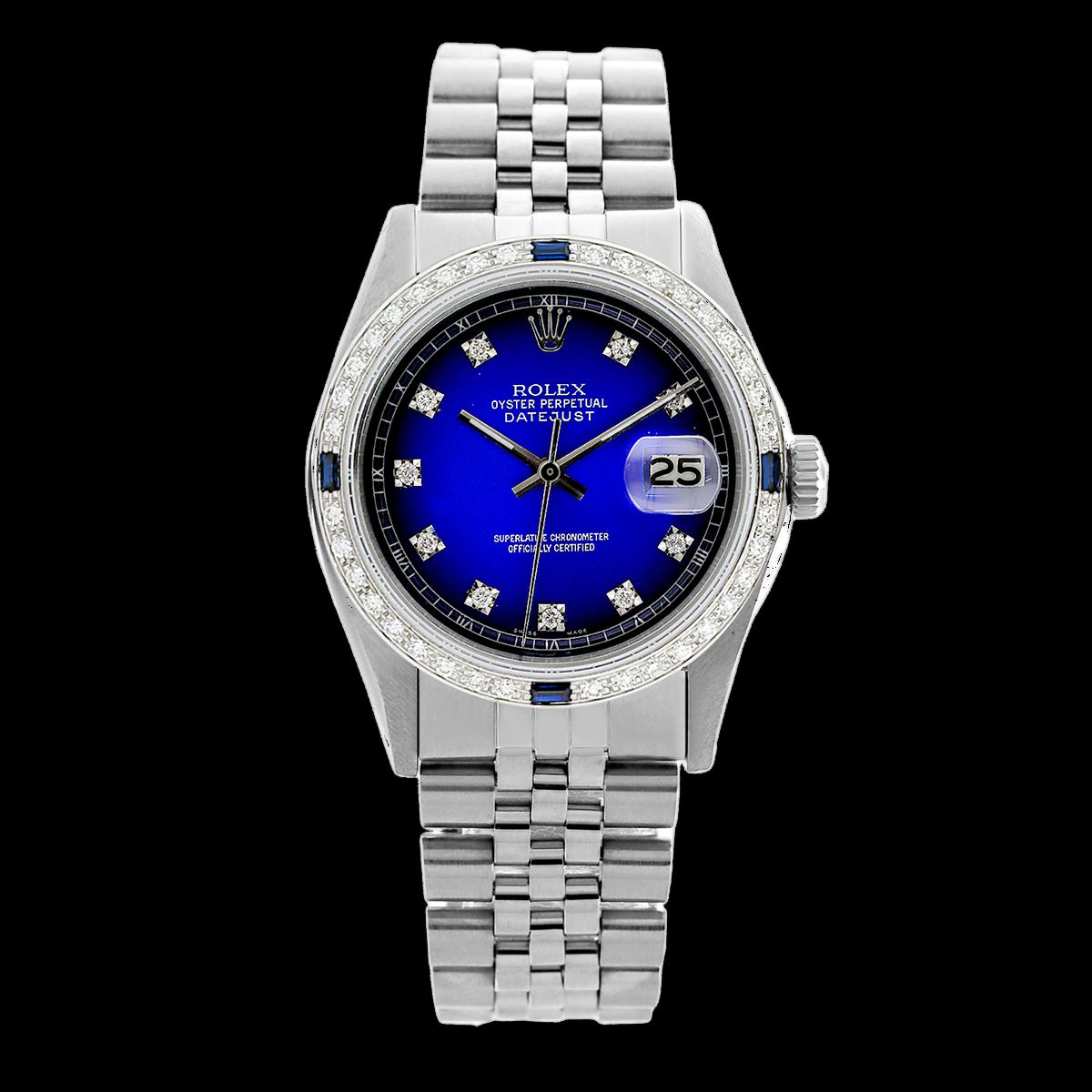 WATCH DETAILS: ITEM: WatchBRAND: RolexTYPE: Stainless SteelFEATURE: QuickSetMODEL: DateJustMADE: Swiss MadeGENDER: Men'sCONDITION: Pre-OwnedFUNCTION: DateDIAL COLOR: BlueHOUR MARKERS: 10 Round Custom Made DiamondBEZEL TYPE: Custom Made Diamond & Sapphire BezelBEZEL STONE: Diamond 1 CTW G-VVS1 & Ceylon Blue SapphireBEZEL MATERIAL: 18K GoldBRACELET TYPE: Jubilee BRACELET MATERIAL: Stainless SteelCLASP TYPE: Folding ClaspCLASP MATERIAL: Stainless SteelCASE STONE: CASE SIZE: 36mmCRYSTAL: Scratch Resistance Sapphire CrystalMOVEMENT: Automatic (Self Winding)CALIBER: 3035CROWN TYPE: Screw Down CrownWATER RESISTANCE: Waterproof to 10 ATM/100 meters/330 feetMODEL #: 16014SKU #: AMSJQS30We Buy/Sell/Trade Valuable watches, Please call us