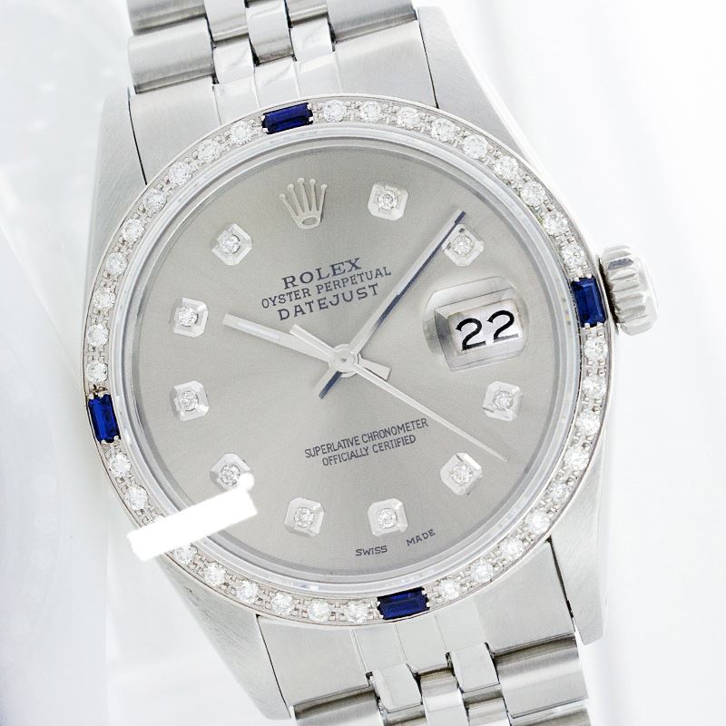 WATCH DETAILS: ITEM: WatchBRAND: RolexTYPE: Stainless SteelFEATURE: QuickSetMODEL: DateJustMADE: Swiss MadeGENDER: Men'sCONDITION: Pre-OwnedFUNCTION: DateDIAL COLOR: GreyHOUR MARKERS: 10 Round Custom Made DiamondBEZEL TYPE: Custom Made Diamond & Sapphire BezelBEZEL STONE: Diamond 1 CTW G-VVS1 & Ceylon Blue SapphireBEZEL MATERIAL: 18K GoldBRACELET TYPE: Jubilee BRACELET MATERIAL: Stainless SteelCLASP TYPE: Folding ClaspCLASP MATERIAL: Stainless SteelCASE STONE: CASE SIZE: 36mmCRYSTAL: Scratch Resistance Sapphire CrystalMOVEMENT: Automatic (Self Winding)CALIBER: 3035CROWN TYPE: Screw Down CrownWATER RESISTANCE: Waterproof to 10 ATM/100 meters/330 feetMODEL #: 16014SKU #: AMSJQS131We Buy/Sell/Trade Valuable watches, Please call us