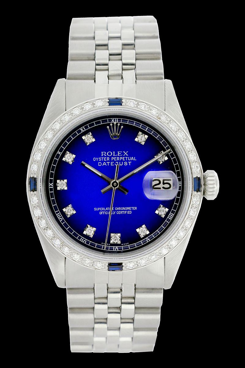 WATCH DETAILS: ITEM: WatchBRAND: RolexTYPE: Stainless SteelFEATURE: QuickSetMODEL: DateJustMADE: Swiss MadeGENDER: Men'sCONDITION: Pre-OwnedFUNCTION: DateDIAL COLOR: Blue Vignette HOUR MARKERS: 10 Round Custom Made DiamondBEZEL TYPE: Custom Made Diamond & Sapphire BezelBEZEL STONE: Diamond 1 CTW G-VVS1 & Ceylon Blue SapphireBEZEL MATERIAL: 18K GoldBRACELET TYPE: Jubilee BRACELET MATERIAL: Stainless SteelCLASP TYPE: Folding ClaspCLASP MATERIAL: Stainless SteelCASE STONE: CASE SIZE: 36mmCRYSTAL: Scratch Resistance Sapphire CrystalMOVEMENT: Automatic (Self Winding)CALIBER: 3035CROWN TYPE: Screw Down CrownWATER RESISTANCE: Waterproof to 10 ATM/100 meters/330 feetMODEL #: 16014SKU #: AMSJQS68We Buy/Sell/Trade Valuable watches, Please call us