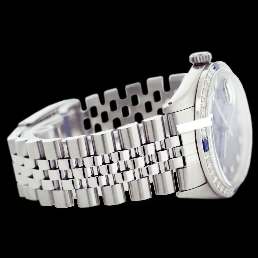 WATCH DETAILS: ITEM: WatchBRAND: RolexTYPE: Stainless SteelFEATURE: QuickSetMODEL: DateJustMADE: Swiss MadeGENDER: Men'sCONDITION: Pre-OwnedFUNCTION: DateDIAL COLOR: BlueHOUR MARKERS: 10 Round Custom Made DiamondBEZEL TYPE: Custom Made Diamond & Sapphire BezelBEZEL STONE: Diamond 1 CTW G-VVS1 & Ceylon Blue SapphireBEZEL MATERIAL: 18K GoldBRACELET TYPE: Jubilee BRACELET MATERIAL: Stainless SteelCLASP TYPE: Folding ClaspCLASP MATERIAL: Stainless SteelCASE STONE: CASE SIZE: 36mmCRYSTAL: Scratch Resistance Sapphire CrystalMOVEMENT: Automatic (Self Winding)CALIBER: 3035CROWN TYPE: Screw Down CrownWATER RESISTANCE: Waterproof to 10 ATM/100 meters/330 feetMODEL #: 16014SKU #: AMSJQS128We Buy/Sell/Trade Valuable watches, Please call us
