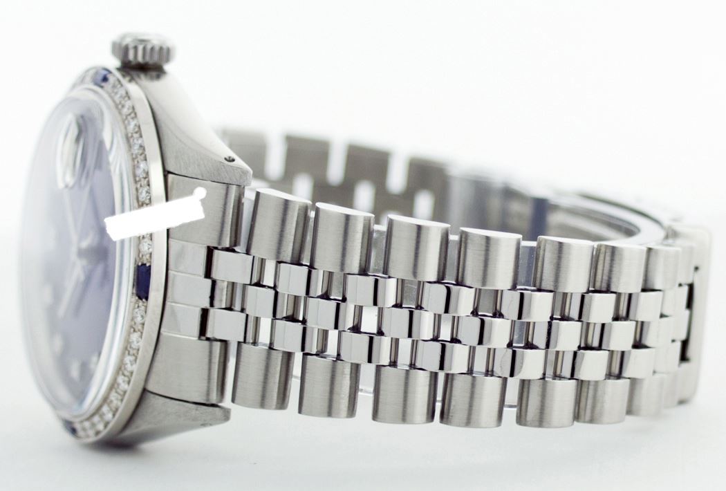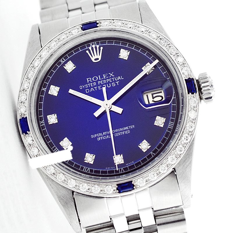 WATCH DETAILS: ITEM: WatchBRAND: RolexTYPE: Stainless SteelFEATURE: QuickSetMODEL: DateJustMADE: Swiss MadeGENDER: Men'sCONDITION: Pre-OwnedFUNCTION: DateDIAL COLOR: BlueHOUR MARKERS: 10 Round Custom Made DiamondBEZEL TYPE: Custom Made Diamond & Sapphire BezelBEZEL STONE: Diamond 1 CTW G-VVS1 & Ceylon Blue SapphireBEZEL MATERIAL: 18K GoldBRACELET TYPE: Jubilee BRACELET MATERIAL: Stainless SteelCLASP TYPE: Folding ClaspCLASP MATERIAL: Stainless SteelCASE STONE: CASE SIZE: 36mmCRYSTAL: Scratch Resistance Sapphire CrystalMOVEMENT: Automatic (Self Winding)CALIBER: 3035CROWN TYPE: Screw Down CrownWATER RESISTANCE: Waterproof to 10 ATM/100 meters/330 feetMODEL #: 16014SKU #: AMSJQS128We Buy/Sell/Trade Valuable watches, Please call us