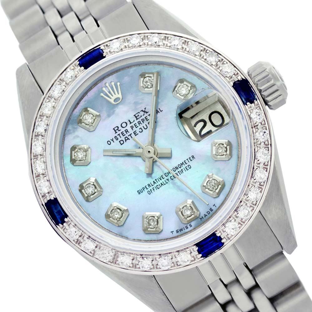 WATCH DETAILS: ITEM: WatchBRAND: RolexTYPE: Stainless SteelFEATURE: QuickSetMODEL: DateJustMADE: Swiss MadeGENDER: Men'sCONDITION: Pre-OwnedFUNCTION: DateDIAL COLOR: Blue Mother Of PearlHOUR MARKERS: 10 Round Custom Made DiamondBEZEL TYPE: Custom Made Diamond & Sapphire BezelBEZEL STONE: Diamond 1 CTW G-VVS1 & Ceylon Blue SapphireBEZEL MATERIAL: 18K GoldBRACELET TYPE: Jubilee BRACELET MATERIAL: Stainless SteelCLASP TYPE: Folding ClaspCLASP MATERIAL: Stainless SteelCASE STONE: CASE SIZE: 36mmCRYSTAL: Scratch Resistance Sapphire CrystalMOVEMENT: Automatic (Self Winding)CALIBER: 3035CROWN TYPE: Screw Down CrownWATER RESISTANCE: Waterproof to 10 ATM/100 meters/330 feetMODEL #: 16014SKU #: AMSJQS50We Buy/Sell/Trade Valuable watches, Please call us