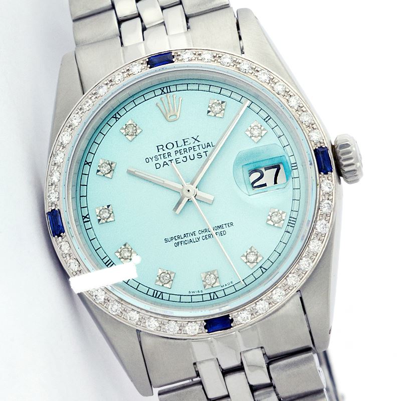 WATCH DETAILS: ITEM: WatchBRAND: RolexTYPE: Stainless SteelFEATURE: QuickSetMODEL: DateJustMADE: Swiss MadeGENDER: Men'sCONDITION: Pre-OwnedFUNCTION: DateDIAL COLOR: BlueHOUR MARKERS: 10 Round Custom Made DiamondBEZEL TYPE: Custom Made Diamond & Sapphire BezelBEZEL STONE: Diamond 1 CTW G-VVS1 & Ceylon Blue SapphireBEZEL MATERIAL: 18K GoldBRACELET TYPE: Jubilee BRACELET MATERIAL: Stainless SteelCLASP TYPE: Folding ClaspCLASP MATERIAL: Stainless SteelCASE STONE: CASE SIZE: 36mmCRYSTAL: Scratch Resistance Sapphire CrystalMOVEMENT: Automatic (Self Winding)CALIBER: 3035CROWN TYPE: Screw Down CrownWATER RESISTANCE: Waterproof to 10 ATM/100 meters/330 feetMODEL #: 16014SKU #: AMSJQS139We Buy/Sell/Trade Valuable watches, Please call us