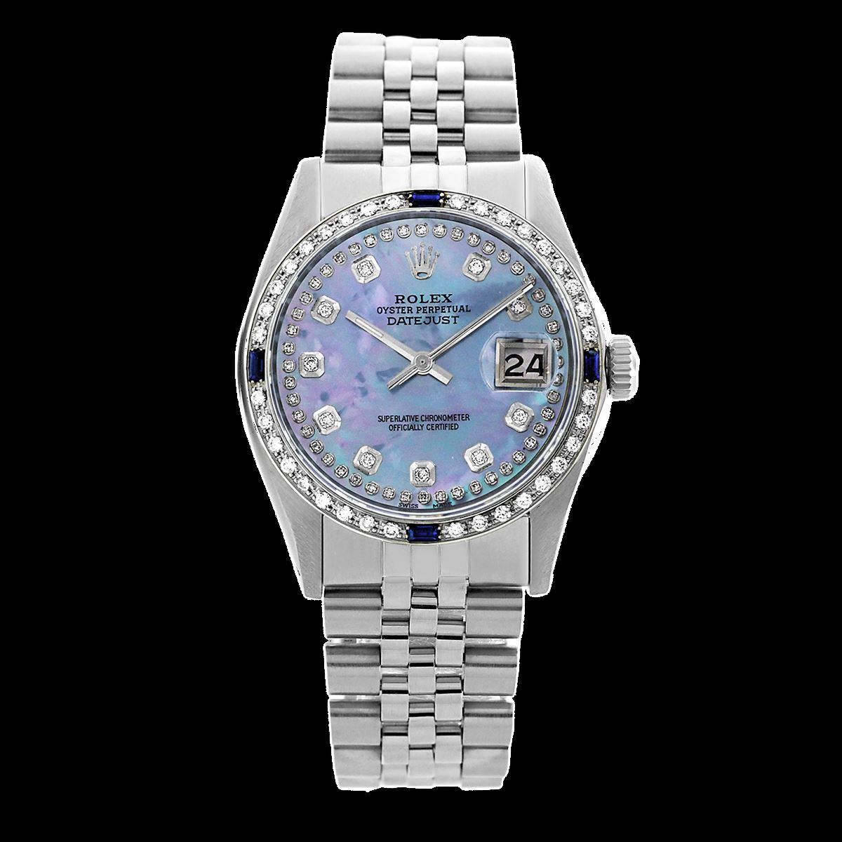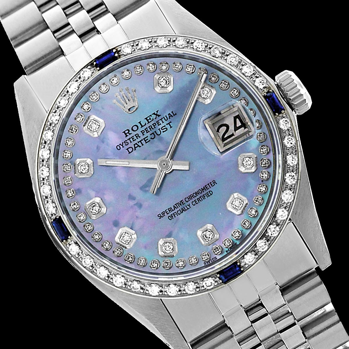 WATCH DETAILS: ITEM: WatchBRAND: RolexTYPE: Stainless SteelFEATURE: QuickSetMODEL: DateJustMADE: Swiss MadeGENDER: Men'sCONDITION: Pre-OwnedFUNCTION: DateDIAL COLOR: PeacockHOUR MARKERS: String Custom Made Diamond + 10 Round Custom Made DiamondBEZEL TYPE: Custom Made Diamond & Sapphire BezelBEZEL STONE: Diamond 1 CTW G-VVS1 & Ceylon Blue SapphireBEZEL MATERIAL: 18K GoldBRACELET TYPE: Jubilee BRACELET MATERIAL: Stainless SteelCLASP TYPE: Folding ClaspCLASP MATERIAL: Stainless SteelCASE STONE: CASE SIZE: 36mmCRYSTAL: Scratch Resistance Sapphire CrystalMOVEMENT: Automatic (Self Winding)CALIBER: 3035CROWN TYPE: Screw Down CrownWATER RESISTANCE: Waterproof to 10 ATM/100 meters/330 feetMODEL #: 16014SKU #: AMSJQS35We Buy/Sell/Trade Valuable watches, Please call us