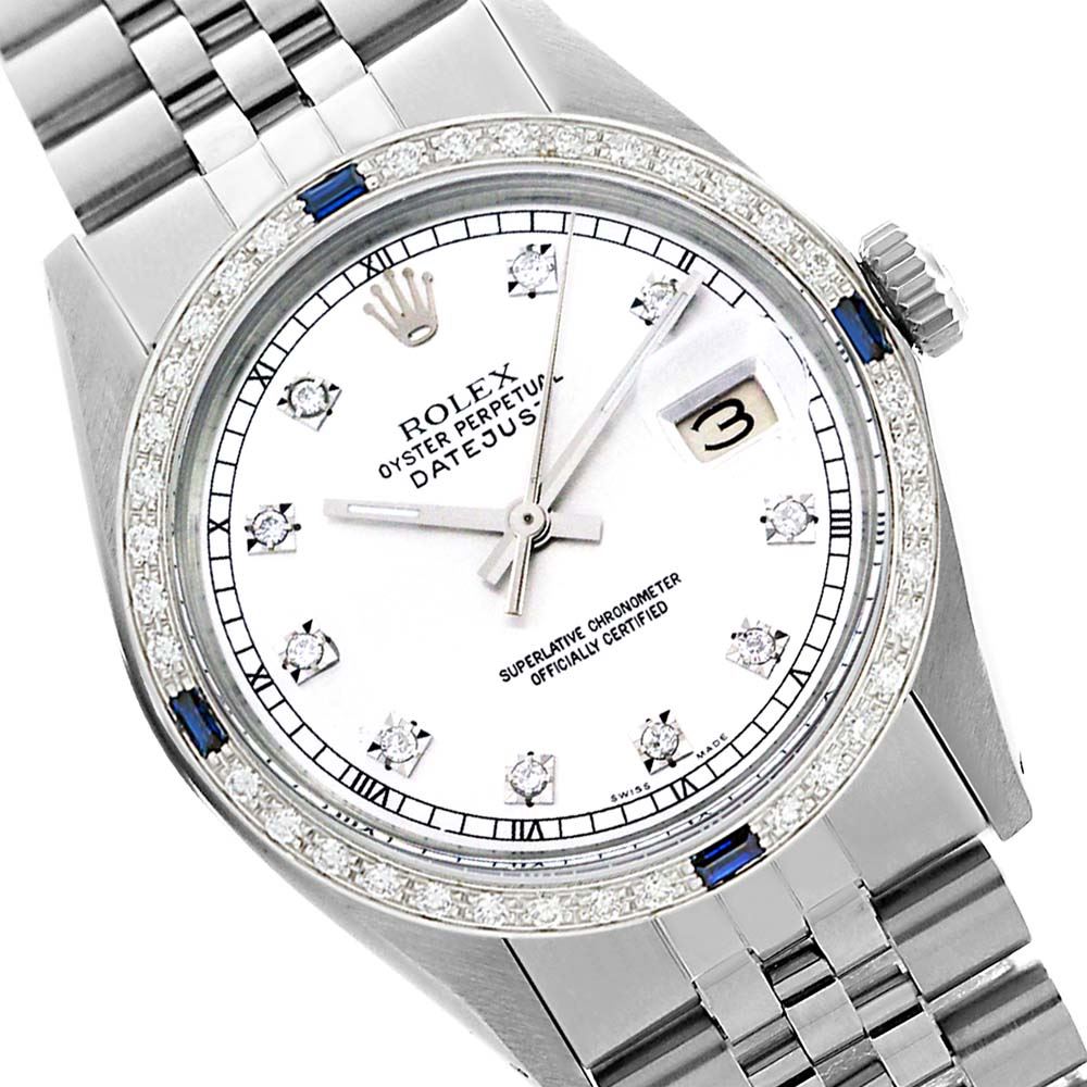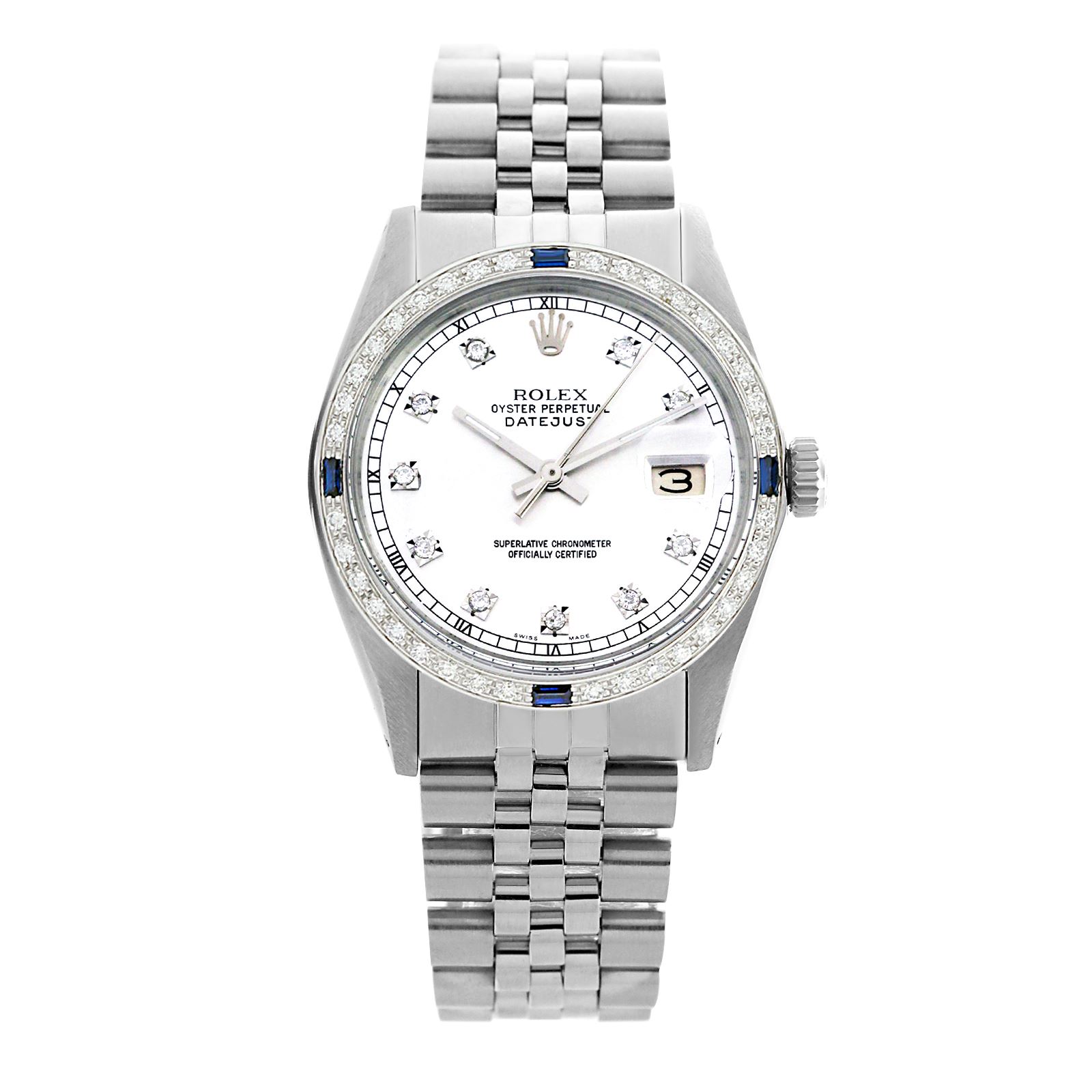 WATCH DETAILS: ITEM: WatchBRAND: RolexTYPE: Stainless SteelFEATURE: QuickSetMODEL: DateJustMADE: Swiss MadeGENDER: Men'sCONDITION: Pre-OwnedFUNCTION: DateDIAL COLOR: SilverHOUR MARKERS: 10 Round Custom Made DiamondBEZEL TYPE: Custom Made Diamond & Sapphire BezelBEZEL STONE: Diamond 1 CTW G-VVS1 & Ceylon Blue SapphireBEZEL MATERIAL: 18K GoldBRACELET TYPE: Jubilee BRACELET MATERIAL: Stainless SteelCLASP TYPE: Folding ClaspCLASP MATERIAL: Stainless SteelCASE STONE: CASE SIZE: 36mmCRYSTAL: Scratch Resistance Sapphire CrystalMOVEMENT: Automatic (Self Winding)CALIBER: 3035CROWN TYPE: Screw Down CrownWATER RESISTANCE: Waterproof to 10 ATM/100 meters/330 feetMODEL #: 16014SKU #: AMSJQS31We Buy/Sell/Trade Valuable watches, Please call us