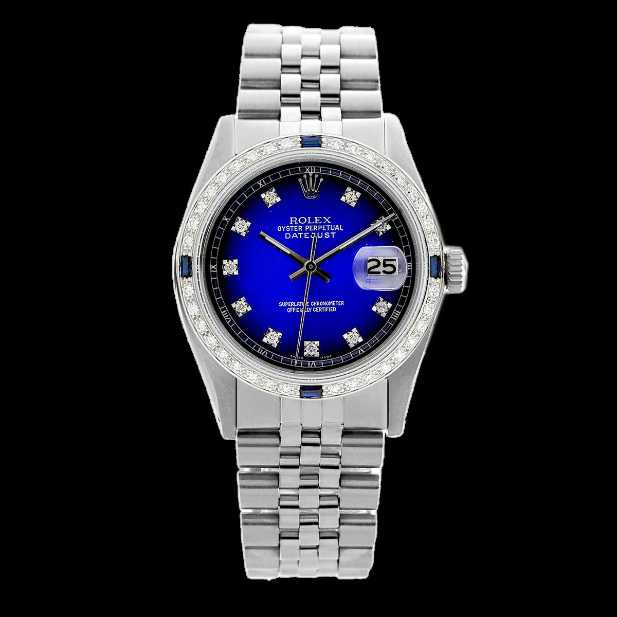 WATCH DETAILS: ITEM: WatchBRAND: RolexTYPE: Stainless SteelFEATURE: QuickSetMODEL: DateJustMADE: Swiss MadeGENDER: Men'sCONDITION: Pre-OwnedFUNCTION: DateDIAL COLOR: BlueHOUR MARKERS: 10 Round Custom Made DiamondBEZEL TYPE: Custom Made Diamond & Sapphire BezelBEZEL STONE: Diamond 1 CTW G-VVS1 & Ceylon Blue SapphireBEZEL MATERIAL: 18K GoldBRACELET TYPE: Jubilee BRACELET MATERIAL: Stainless SteelCLASP TYPE: Folding ClaspCLASP MATERIAL: Stainless SteelCASE STONE: CASE SIZE: 36mmCRYSTAL: Scratch Resistance Sapphire CrystalMOVEMENT: Automatic (Self Winding)CALIBER: 3035CROWN TYPE: Screw Down CrownWATER RESISTANCE: Waterproof to 10 ATM/100 meters/330 feetMODEL #: 16014SKU #: AMSJQS39We Buy/Sell/Trade Valuable watches, Please call us