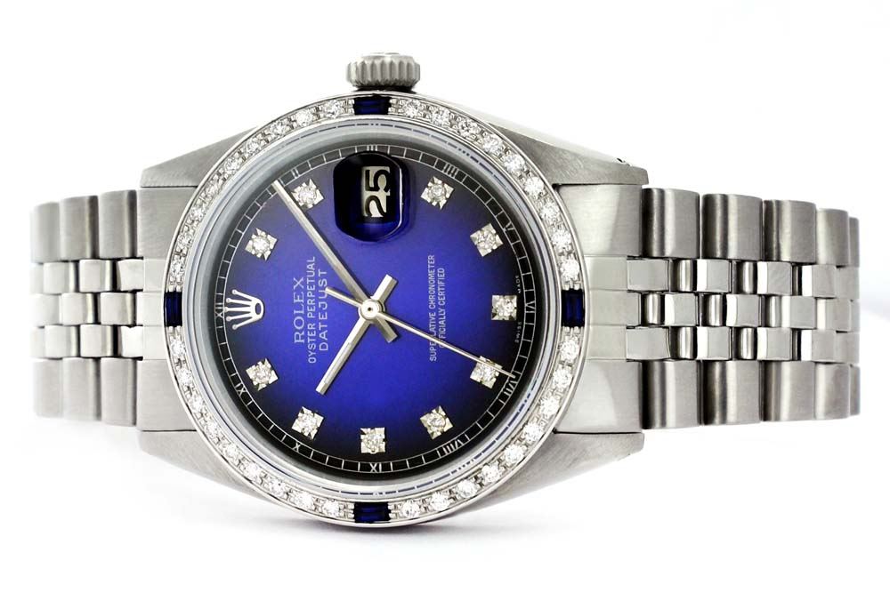 WATCH DETAILS: ITEM: WatchBRAND: RolexTYPE: Stainless SteelFEATURE: QuickSetMODEL: DateJustMADE: Swiss MadeGENDER: Men'sCONDITION: Pre-OwnedFUNCTION: DateDIAL COLOR: Blue Vignette HOUR MARKERS: 10 Round Custom Made DiamondBEZEL TYPE: Custom Made Diamond & Sapphire BezelBEZEL STONE: Diamond 1 CTW G-VVS1 & Ceylon Blue SapphireBEZEL MATERIAL: 18K GoldBRACELET TYPE: Jubilee BRACELET MATERIAL: Stainless SteelCLASP TYPE: Folding ClaspCLASP MATERIAL: Stainless SteelCASE STONE: CASE SIZE: 36mmCRYSTAL: Scratch Resistance Sapphire CrystalMOVEMENT: Automatic (Self Winding)CALIBER: 3035CROWN TYPE: Screw Down CrownWATER RESISTANCE: Waterproof to 10 ATM/100 meters/330 feetMODEL #: 16014SKU #: AMSJQS68We Buy/Sell/Trade Valuable watches, Please call us