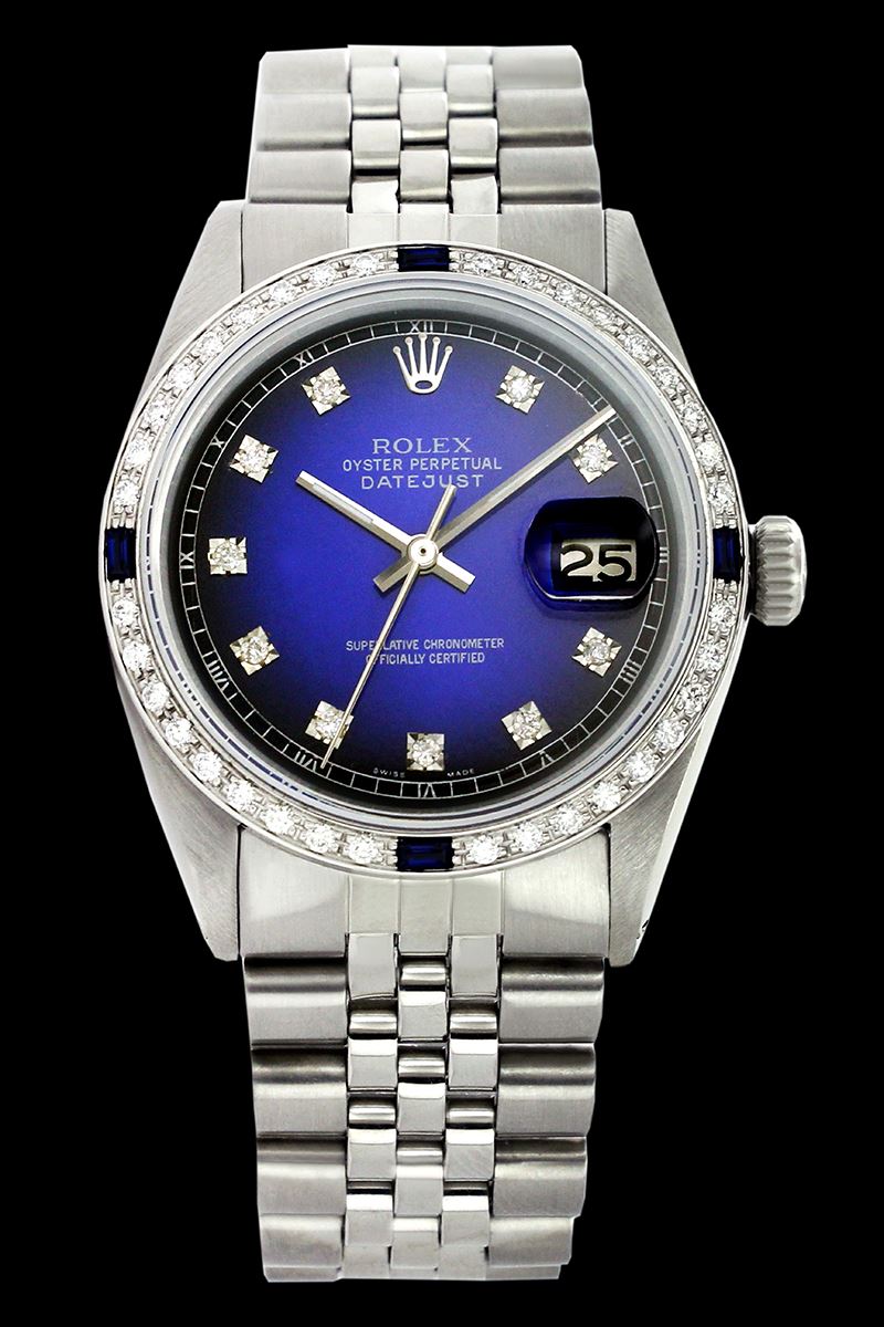 WATCH DETAILS: ITEM: WatchBRAND: RolexTYPE: Stainless SteelFEATURE: QuickSetMODEL: DateJustMADE: Swiss MadeGENDER: Men'sCONDITION: Pre-OwnedFUNCTION: DateDIAL COLOR: Blue Vignette HOUR MARKERS: 10 Round Custom Made DiamondBEZEL TYPE: Custom Made Diamond & Sapphire BezelBEZEL STONE: Diamond 1 CTW G-VVS1 & Ceylon Blue SapphireBEZEL MATERIAL: 18K GoldBRACELET TYPE: Jubilee BRACELET MATERIAL: Stainless SteelCLASP TYPE: Folding ClaspCLASP MATERIAL: Stainless SteelCASE STONE: CASE SIZE: 36mmCRYSTAL: Scratch Resistance Sapphire CrystalMOVEMENT: Automatic (Self Winding)CALIBER: 3035CROWN TYPE: Screw Down CrownWATER RESISTANCE: Waterproof to 10 ATM/100 meters/330 feetMODEL #: 16014SKU #: AMSJQS68We Buy/Sell/Trade Valuable watches, Please call us