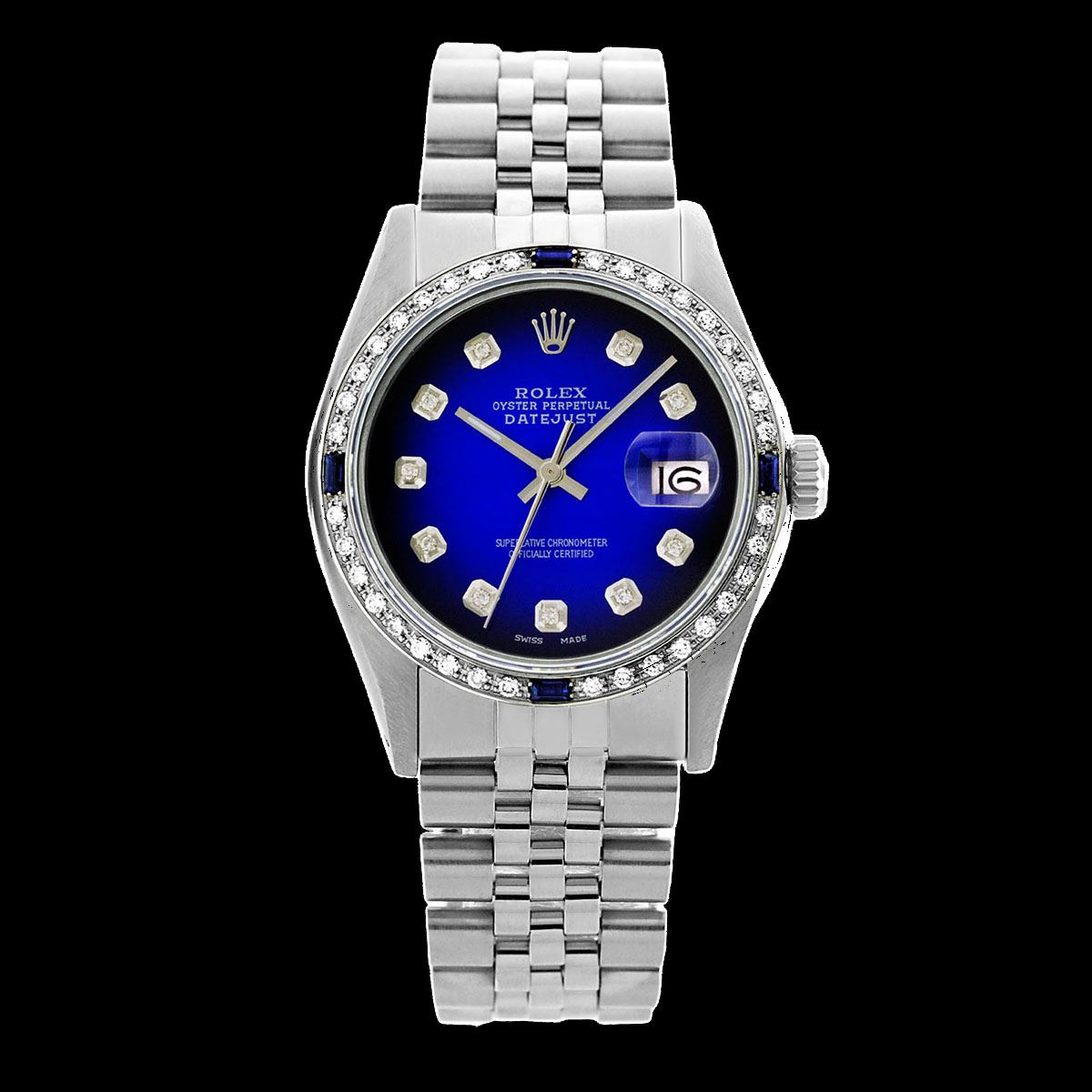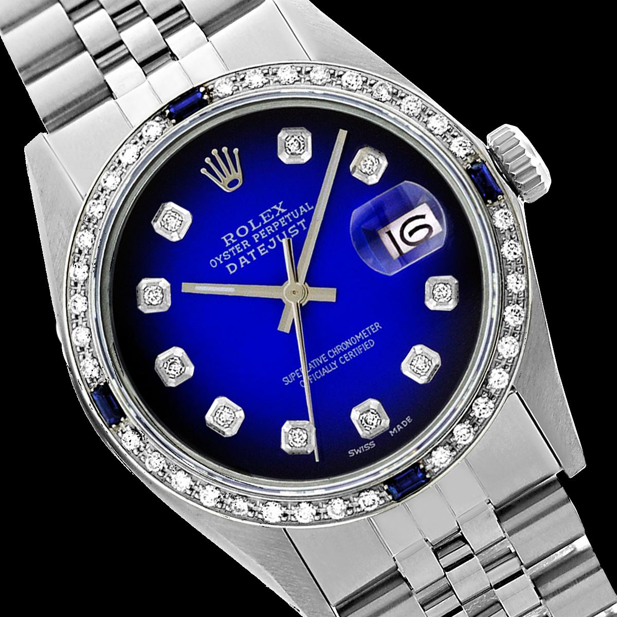 WATCH DETAILS: ITEM: WatchBRAND: RolexTYPE: Stainless SteelFEATURE: QuickSetMODEL: DateJustMADE: Swiss MadeGENDER: Men'sCONDITION: Pre-OwnedFUNCTION: DateDIAL COLOR: BlueHOUR MARKERS: 10 Round Custom Made DiamondBEZEL TYPE: Custom Made Diamond & Sapphire BezelBEZEL STONE: Diamond 1 CTW G-VVS1 & Ceylon Blue SapphireBEZEL MATERIAL: 18K GoldBRACELET TYPE: Jubilee BRACELET MATERIAL: Stainless SteelCLASP TYPE: Folding ClaspCLASP MATERIAL: Stainless SteelCASE STONE: CASE SIZE: 36mmCRYSTAL: Scratch Resistance Sapphire CrystalMOVEMENT: Automatic (Self Winding)CALIBER: 3035CROWN TYPE: Screw Down CrownWATER RESISTANCE: Waterproof to 10 ATM/100 meters/330 feetMODEL #: 16014SKU #: AMSJQS168We Buy/Sell/Trade Valuable watches, Please call us