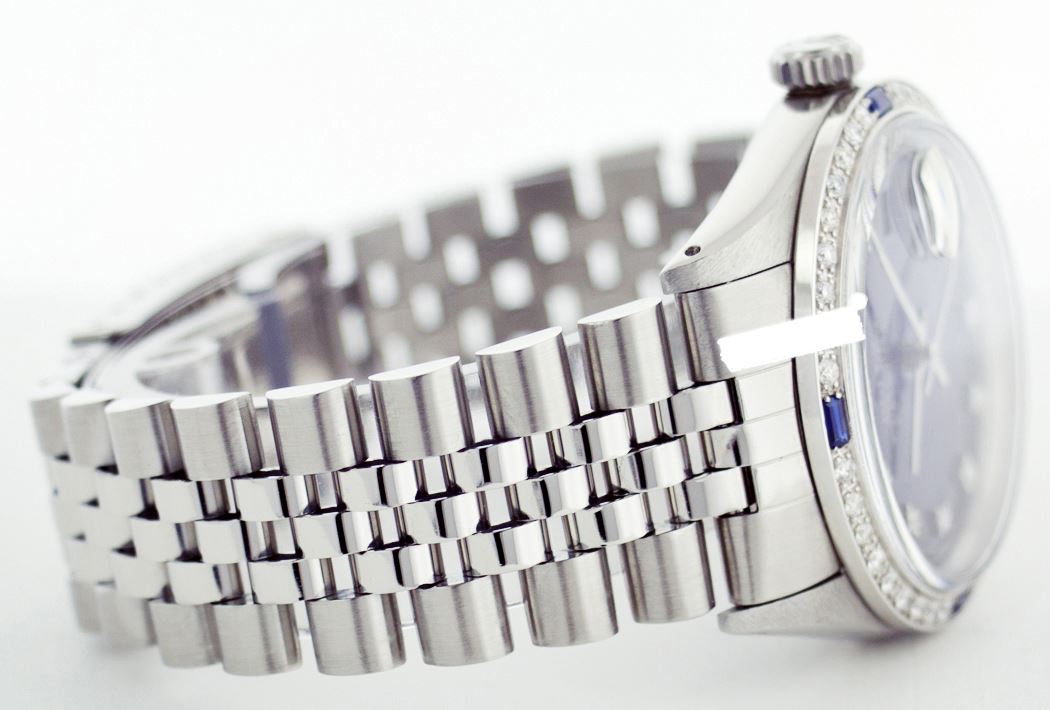 WATCH DETAILS: ITEM: WatchBRAND: RolexTYPE: Stainless SteelFEATURE: QuickSetMODEL: DateJustMADE: Swiss MadeGENDER: Men'sCONDITION: Pre-OwnedFUNCTION: DateDIAL COLOR: BlueHOUR MARKERS: 10 Round Custom Made DiamondBEZEL TYPE: Custom Made Diamond & Sapphire BezelBEZEL STONE: Diamond 1 CTW G-VVS1 & Ceylon Blue SapphireBEZEL MATERIAL: 18K GoldBRACELET TYPE: Jubilee BRACELET MATERIAL: Stainless SteelCLASP TYPE: Folding ClaspCLASP MATERIAL: Stainless SteelCASE STONE: CASE SIZE: 36mmCRYSTAL: Scratch Resistance Sapphire CrystalMOVEMENT: Automatic (Self Winding)CALIBER: 3035CROWN TYPE: Screw Down CrownWATER RESISTANCE: Waterproof to 10 ATM/100 meters/330 feetMODEL #: 16014SKU #: AMSJQS128We Buy/Sell/Trade Valuable watches, Please call us