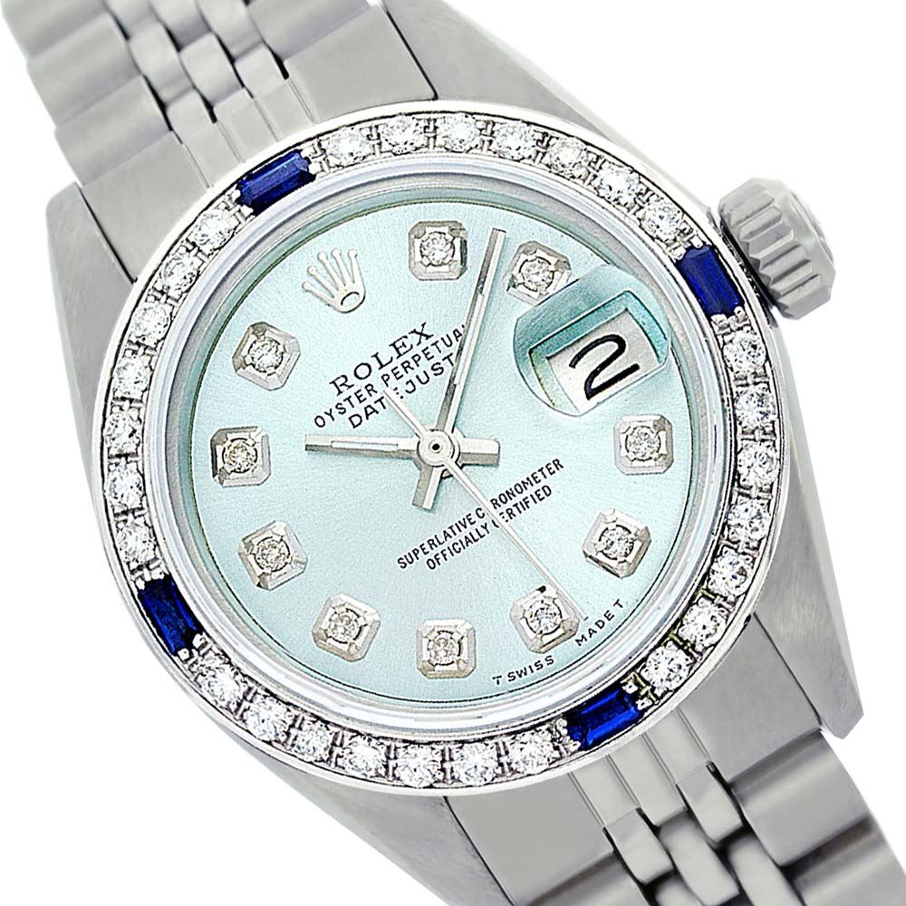 WATCH DETAILS: ITEM:     WatchBRAND:     RolexTYPE:     Stainless SteelFEATURE:     QuickSetMODEL:     DateJustMADE:     Swiss MadeGENDER:     Men'sCONDITION:     Pre-OwnedFUNCTION:     DateDIAL COLOR:     Dark Ice BlueHOUR MARKERS:     10 Round Custom Made DiamondBEZEL TYPE:     Custom Made Diamond & Sapphire BezelBEZEL STONE:     Diamond 1 CTW G-VVS1  & Ceylon Blue SapphireBEZEL MATERIAL:     18K GoldBRACELET TYPE:     Jubilee BRACELET MATERIAL:     Stainless SteelCLASP TYPE:     Folding ClaspCLASP MATERIAL:     Stainless SteelCASE STONE:     CASE SIZE:     36mmCRYSTAL:      Scratch Resistance Sapphire CrystalMOVEMENT:     Automatic (Self Winding)CALIBER:     3035CROWN TYPE:     Screw Down CrownWATER RESISTANCE:     Waterproof to 10 ATM/100 meters/330 feetMODEL #:     16014SKU #:     AMSJQS90We Buy/Sell/Trade Valuable watches, Please call us