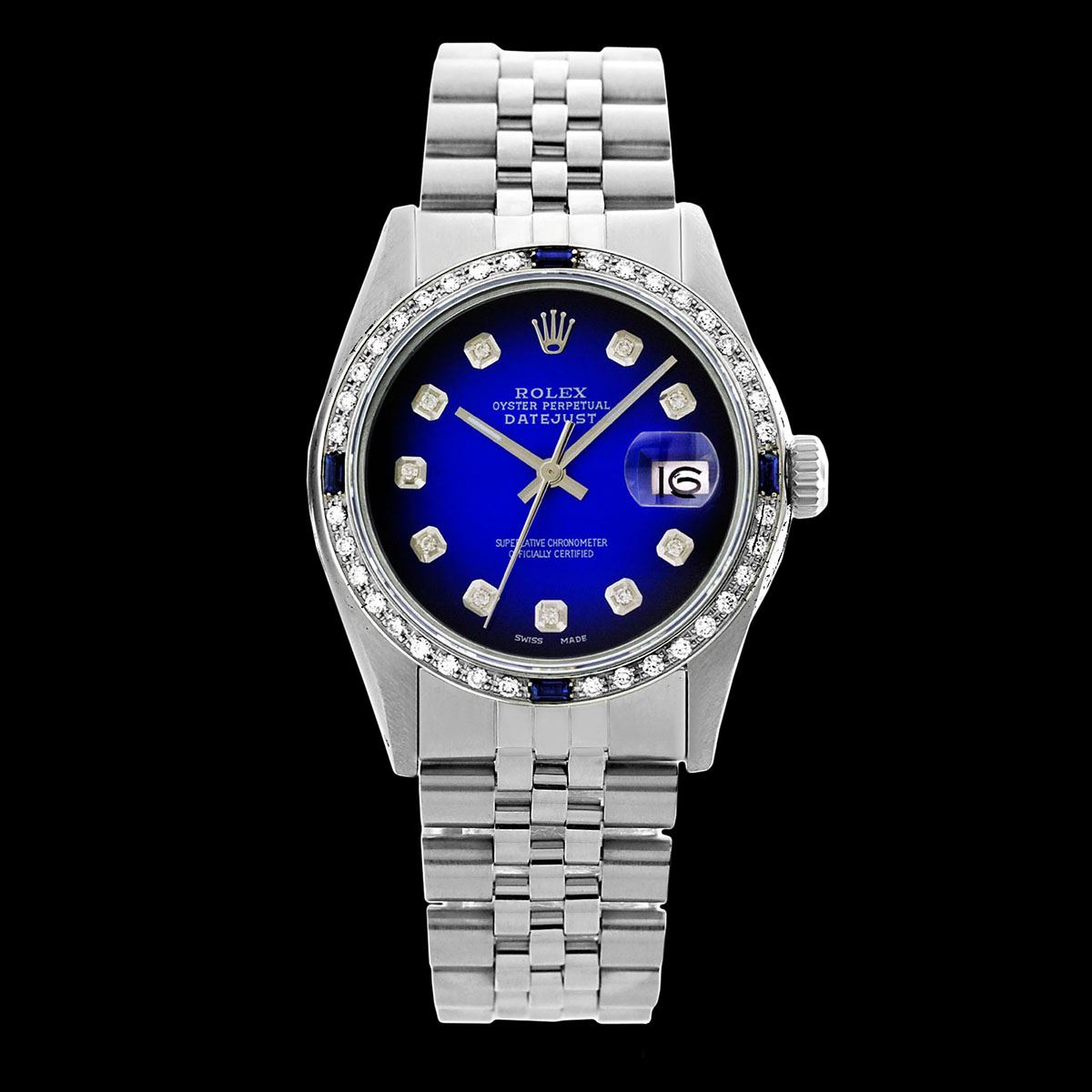 WATCH DETAILS: ITEM: WatchBRAND: RolexTYPE: Stainless SteelFEATURE: QuickSetMODEL: DateJustMADE: Swiss MadeGENDER: Men'sCONDITION: Pre-OwnedFUNCTION: DateDIAL COLOR: BlueHOUR MARKERS: 10 Round Custom Made DiamondBEZEL TYPE: Custom Made Diamond & Sapphire BezelBEZEL STONE: Diamond 1 CTW G-VVS1 & Ceylon Blue SapphireBEZEL MATERIAL: 18K GoldBRACELET TYPE: Jubilee BRACELET MATERIAL: Stainless SteelCLASP TYPE: Folding ClaspCLASP MATERIAL: Stainless SteelCASE STONE: CASE SIZE: 36mmCRYSTAL: Scratch Resistance Sapphire CrystalMOVEMENT: Automatic (Self Winding)CALIBER: 3035CROWN TYPE: Screw Down CrownWATER RESISTANCE: Waterproof to 10 ATM/100 meters/330 feetMODEL #: 16014SKU #: AMSJQS184We Buy/Sell/Trade Valuable watches, Please call us