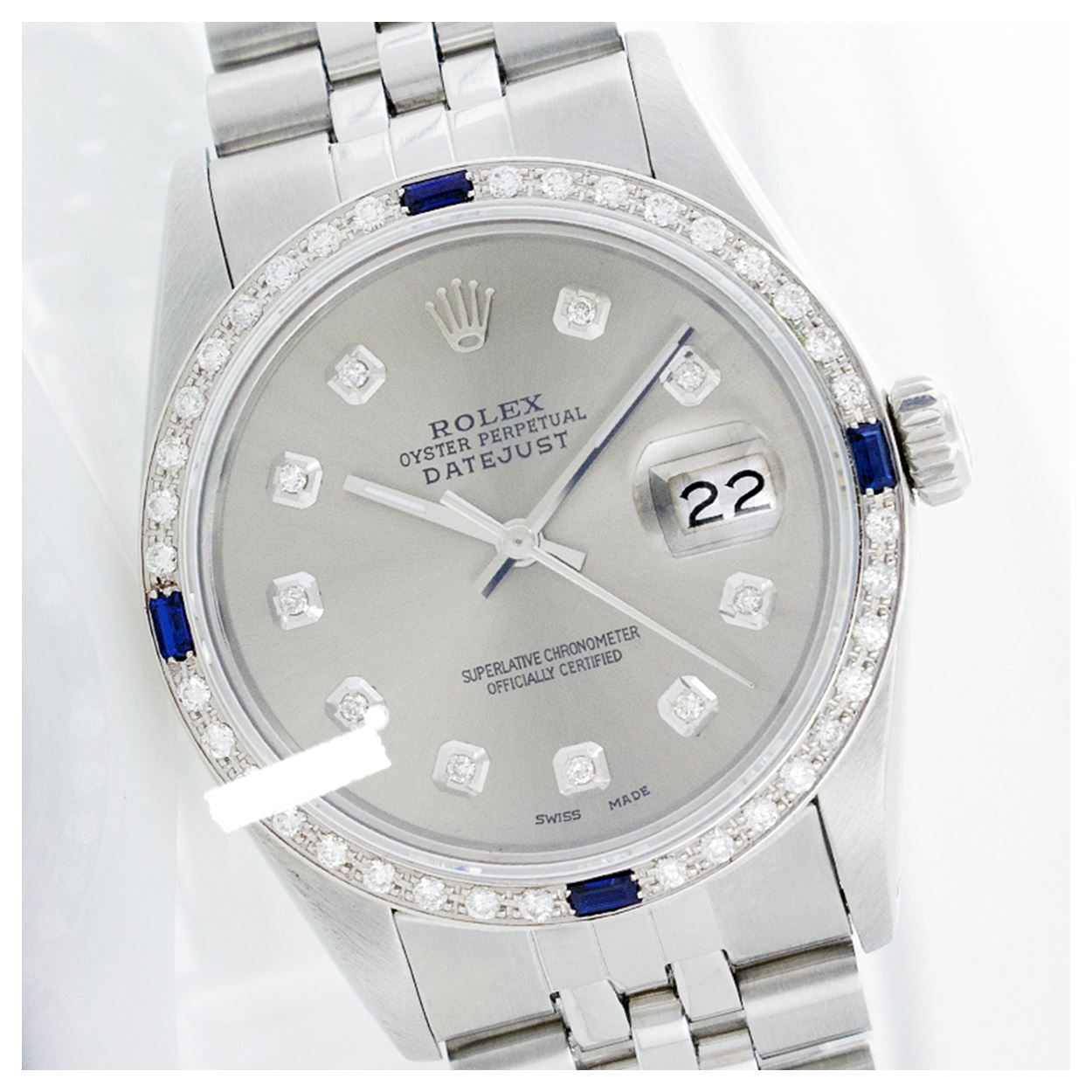 WATCH DETAILS: ITEM: WatchBRAND: RolexTYPE: Stainless SteelFEATURE: QuickSetMODEL: DateJustMADE: Swiss MadeGENDER: Men'sCONDITION: Pre-OwnedFUNCTION: DateDIAL COLOR: SilverHOUR MARKERS: 10 Round Custom Made DiamondBEZEL TYPE: Custom Made Diamond & Sapphire BezelBEZEL STONE: Diamond 1 CTW G-VVS1 & Ceylon Blue SapphireBEZEL MATERIAL: 18K GoldBRACELET TYPE: Jubilee BRACELET MATERIAL: Stainless SteelCLASP TYPE: Folding ClaspCLASP MATERIAL: Stainless SteelCASE STONE: CASE SIZE: 36mmCRYSTAL: Scratch Resistance Sapphire CrystalMOVEMENT: Automatic (Self Winding)CALIBER: 3035CROWN TYPE: Screw Down CrownWATER RESISTANCE: Waterproof to 10 ATM/100 meters/330 feetMODEL #: 16014SKU #: AMSJQS129We Buy/Sell/Trade Valuable watches, Please call us