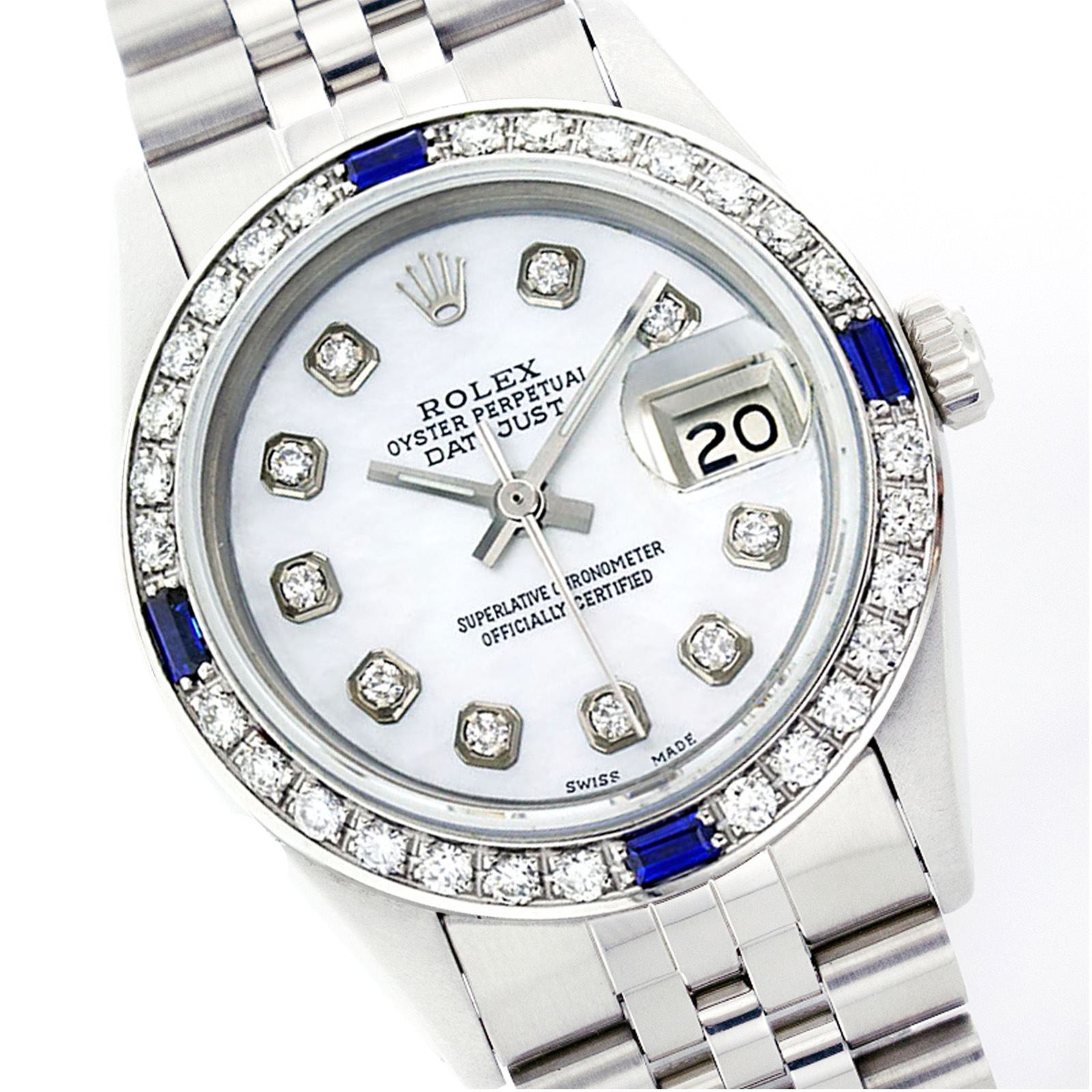 WATCH DETAILS: ITEM: WatchBRAND: RolexTYPE: Stainless SteelFEATURE: QuickSetMODEL: DateJustMADE: Swiss MadeGENDER: Men'sCONDITION: Pre-OwnedFUNCTION: DateDIAL COLOR: White Mother Of PearlHOUR MARKERS: 10 Round Custom Made DiamondBEZEL TYPE: Custom Made Diamond & Sapphire BezelBEZEL STONE: Diamond 1 CTW G-VVS1 & Ceylon Blue SapphireBEZEL MATERIAL: 18K GoldBRACELET TYPE: Jubilee BRACELET MATERIAL: Stainless SteelCLASP TYPE: Folding ClaspCLASP MATERIAL: Stainless SteelCASE STONE: CASE SIZE: 36mmCRYSTAL: Scratch Resistance Sapphire CrystalMOVEMENT: Automatic (Self Winding)CALIBER: 3035CROWN TYPE: Screw Down CrownWATER RESISTANCE: Waterproof to 10 ATM/100 meters/330 feetMODEL #: 16014SKU #: AMSJQS29We Buy/Sell/Trade Valuable watches, Please call us