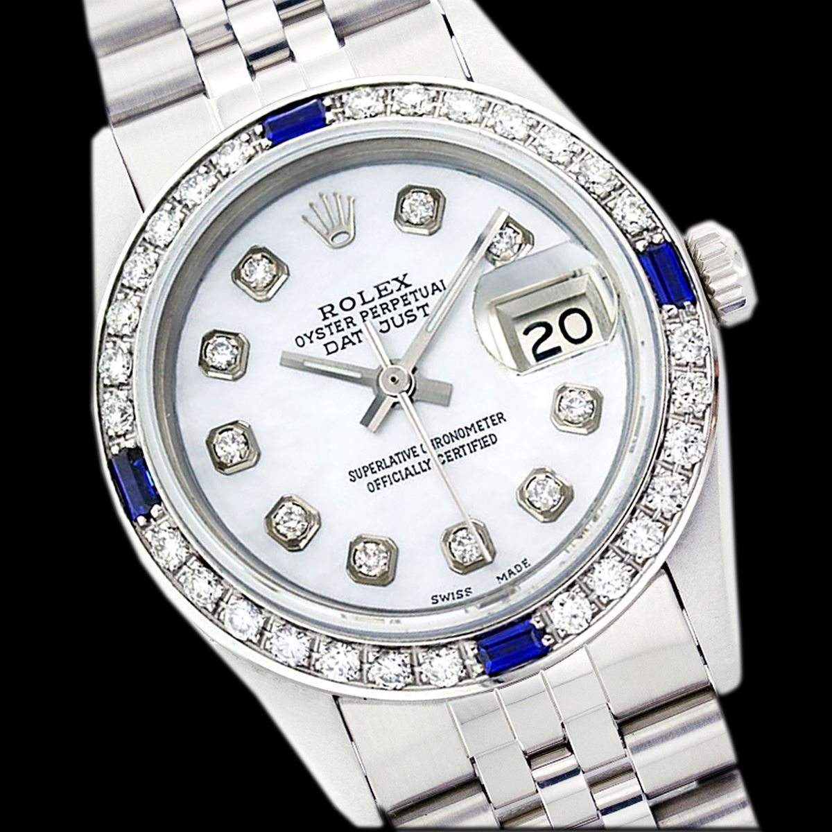 WATCH DETAILS: ITEM:     WatchBRAND:     RolexTYPE:     Stainless SteelFEATURE:     QuickSetMODEL:     DateJustMADE:     Swiss MadeGENDER:     Men'sCONDITION:     Pre-OwnedFUNCTION:     DateDIAL COLOR:     White Mother Of PearlHOUR MARKERS:     10 Round Custom Made DiamondBEZEL TYPE:     Custom Made Diamond & Sapphire BezelBEZEL STONE:     Diamond 1 CTW G-VVS1  & Ceylon Blue SapphireBEZEL MATERIAL:     18K GoldBRACELET TYPE:     Jubilee BRACELET MATERIAL:     Stainless SteelCLASP TYPE:     Folding ClaspCLASP MATERIAL:     Stainless SteelCASE STONE:     CASE SIZE:     36mmCRYSTAL:      Scratch Resistance Sapphire CrystalMOVEMENT:     Automatic (Self Winding)CALIBER:     3035CROWN TYPE:     Screw Down CrownWATER RESISTANCE:     Waterproof to 10 ATM/100 meters/330 feetMODEL #:     16014SKU #:     AMSJQS29We Buy/Sell/Trade Valuable watches, Please call us
