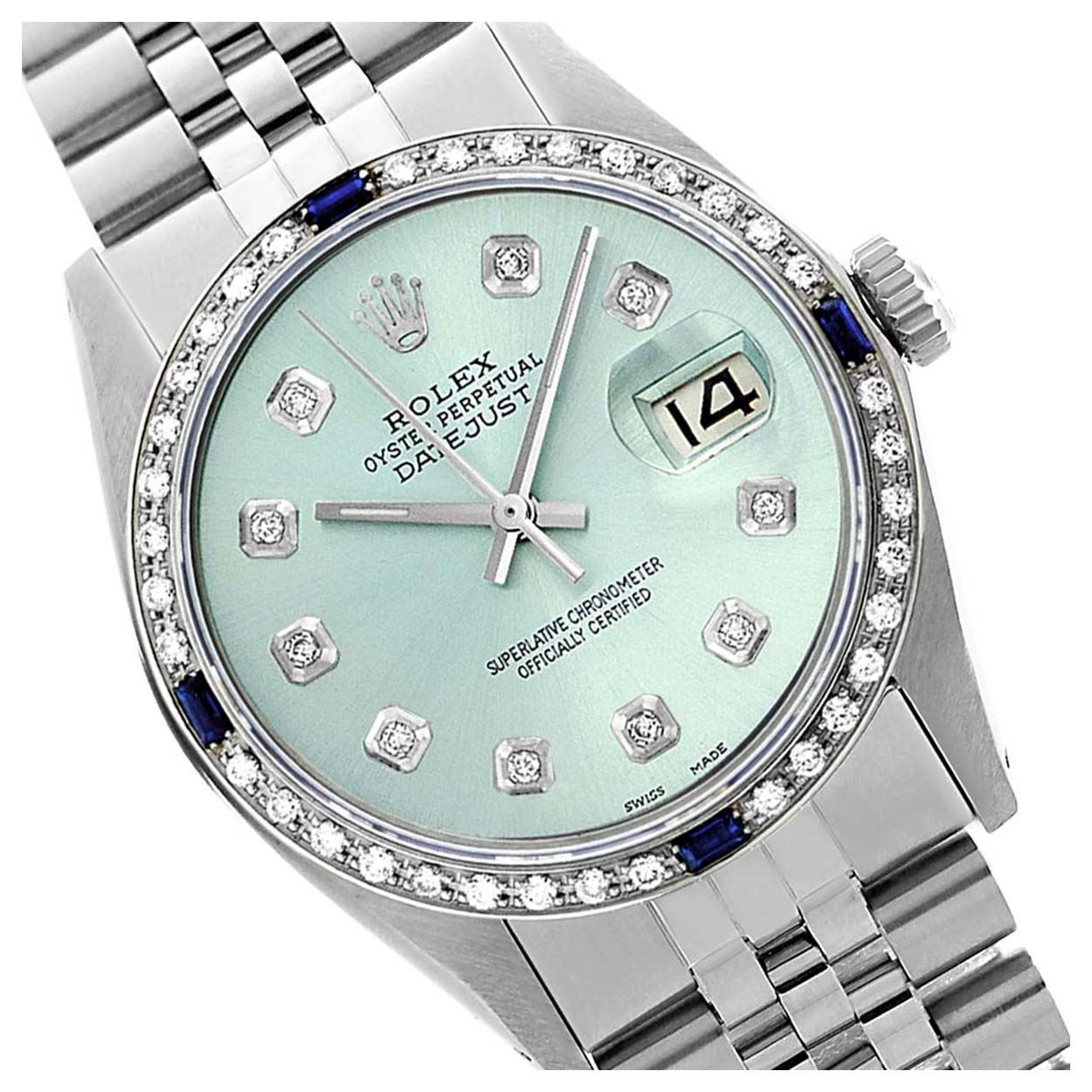 WATCH DETAILS: ITEM: WatchBRAND: RolexTYPE: Stainless SteelFEATURE: QuickSetMODEL: DateJustMADE: Swiss MadeGENDER: Men'sCONDITION: Pre-OwnedFUNCTION: DateDIAL COLOR: Ice BlueHOUR MARKERS: 10 Round Custom Made DiamondBEZEL TYPE: Custom Made Diamond & Sapphire BezelBEZEL STONE: Diamond 1 CTW G-VVS1 & Ceylon Blue SapphireBEZEL MATERIAL: 18K GoldBRACELET TYPE: Jubilee BRACELET MATERIAL: Stainless SteelCLASP TYPE: Folding ClaspCLASP MATERIAL: Stainless SteelCASE STONE: CASE SIZE: 36mmCRYSTAL: Scratch Resistance Sapphire CrystalMOVEMENT: Automatic (Self Winding)CALIBER: 3035CROWN TYPE: Screw Down CrownWATER RESISTANCE: Waterproof to 10 ATM/100 meters/330 feetMODEL #: 16014SKU #: AMSJQS37We Buy/Sell/Trade Valuable watches, Please call us