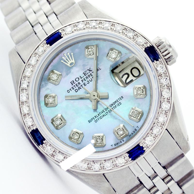 WATCH DETAILS: ITEM: WatchBRAND: RolexTYPE: Stainless SteelFEATURE: QuickSetMODEL: DateJustMADE: Swiss MadeGENDER: Men'sCONDITION: Pre-OwnedFUNCTION: DateDIAL COLOR: Mother Of PearlHOUR MARKERS: 10 Round Custom Made DiamondBEZEL TYPE: Custom Made Diamond & Sapphire BezelBEZEL STONE: Diamond 1 CTW G-VVS1 & Ceylon Blue SapphireBEZEL MATERIAL: 18K GoldBRACELET TYPE: Jubilee BRACELET MATERIAL: Stainless SteelCLASP TYPE: Folding ClaspCLASP MATERIAL: Stainless SteelCASE STONE: CASE SIZE: 36mmCRYSTAL: Scratch Resistance Sapphire CrystalMOVEMENT: Automatic (Self Winding)CALIBER: 3035CROWN TYPE: Screw Down CrownWATER RESISTANCE: Waterproof to 10 ATM/100 meters/330 feetMODEL #: 16014SKU #: AMSJQS150We Buy/Sell/Trade Valuable watches, Please call us