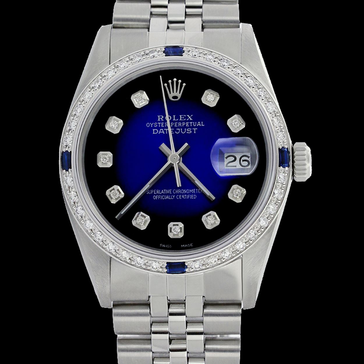 WATCH DETAILS: ITEM: WatchBRAND: RolexTYPE: Stainless SteelFEATURE: QuickSetMODEL: DateJustMADE: Swiss MadeGENDER: Men'sCONDITION: Pre-OwnedFUNCTION: DateDIAL COLOR: Blue Vignette HOUR MARKERS: 10 Round Custom Made DiamondBEZEL TYPE: Custom Made Diamond & Sapphire BezelBEZEL STONE: Diamond 1 CTW G-VVS1 & Ceylon Blue SapphireBEZEL MATERIAL: 18K GoldBRACELET TYPE: Jubilee BRACELET MATERIAL: Stainless SteelCLASP TYPE: Folding ClaspCLASP MATERIAL: Stainless SteelCASE STONE: CASE SIZE: 36mmCRYSTAL: Scratch Resistance Sapphire CrystalMOVEMENT: Automatic (Self Winding)CALIBER: 3035CROWN TYPE: Screw Down CrownWATER RESISTANCE: Waterproof to 10 ATM/100 meters/330 feetMODEL #: 16014SKU #: AMSJQS28We Buy/Sell/Trade Valuable watches, Please call us