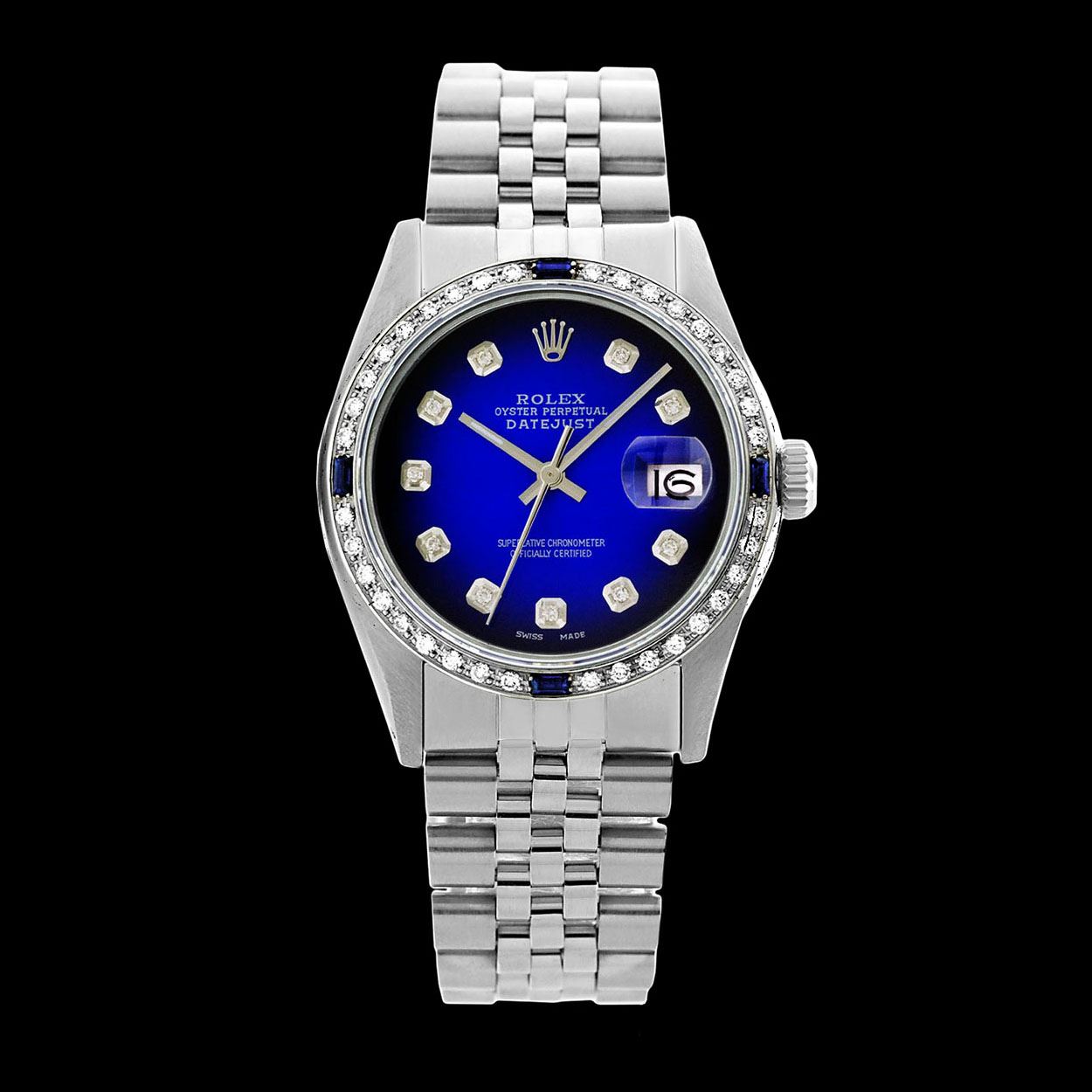 WATCH DETAILS: ITEM: WatchBRAND: RolexTYPE: Stainless SteelFEATURE: QuickSetMODEL: DateJustMADE: Swiss MadeGENDER: Men'sCONDITION: Pre-OwnedFUNCTION: DateDIAL COLOR: BlueHOUR MARKERS: 10 Round Custom Made DiamondBEZEL TYPE: Custom Made Diamond & Sapphire BezelBEZEL STONE: Diamond 1 CTW G-VVS1 & Ceylon Blue SapphireBEZEL MATERIAL: 18K GoldBRACELET TYPE: Jubilee BRACELET MATERIAL: Stainless SteelCLASP TYPE: Folding ClaspCLASP MATERIAL: Stainless SteelCASE STONE: CASE SIZE: 36mmCRYSTAL: Scratch Resistance Sapphire CrystalMOVEMENT: Automatic (Self Winding)CALIBER: 3035CROWN TYPE: Screw Down CrownWATER RESISTANCE: Waterproof to 10 ATM/100 meters/330 feetMODEL #: 16014SKU #: AMSJQS184We Buy/Sell/Trade Valuable watches, Please call us