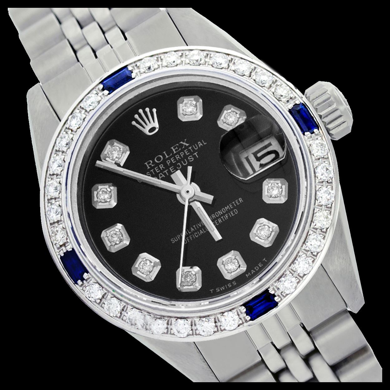 WATCH DETAILS: ITEM: WatchBRAND: RolexTYPE: Stainless SteelFEATURE: QuickSetMODEL: DateJustMADE: Swiss MadeGENDER: Men'sCONDITION: Pre-OwnedFUNCTION: DateDIAL COLOR: BlackHOUR MARKERS: 10 Round Custom Made DiamondBEZEL TYPE: Custom Made Diamond & Sapphire BezelBEZEL STONE: Diamond 1 CTW G-VVS1 & Ceylon Blue SapphireBEZEL MATERIAL: 18K GoldBRACELET TYPE: Jubilee BRACELET MATERIAL: Stainless SteelCLASP TYPE: Folding ClaspCLASP MATERIAL: Stainless SteelCASE STONE: CASE SIZE: 36mmCRYSTAL: Scratch Resistance Sapphire CrystalMOVEMENT: Automatic (Self Winding)CALIBER: 3035CROWN TYPE: Screw Down CrownWATER RESISTANCE: Waterproof to 10 ATM/100 meters/330 feetMODEL #: 16014SKU #: AMSJQS49We Buy/Sell/Trade Valuable watches, Please call us
