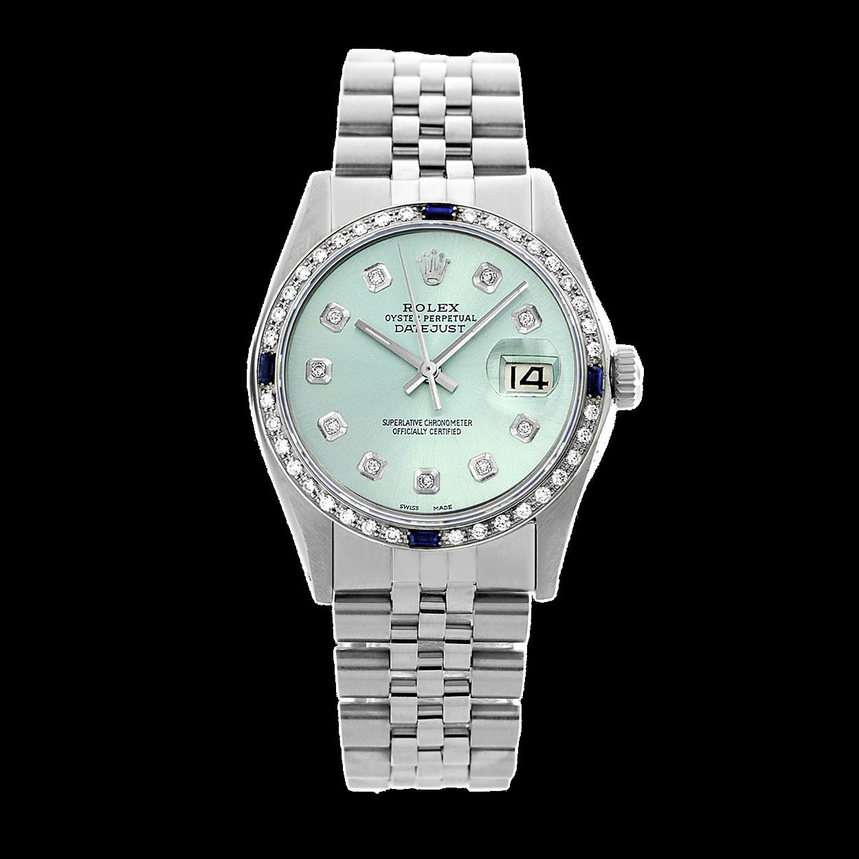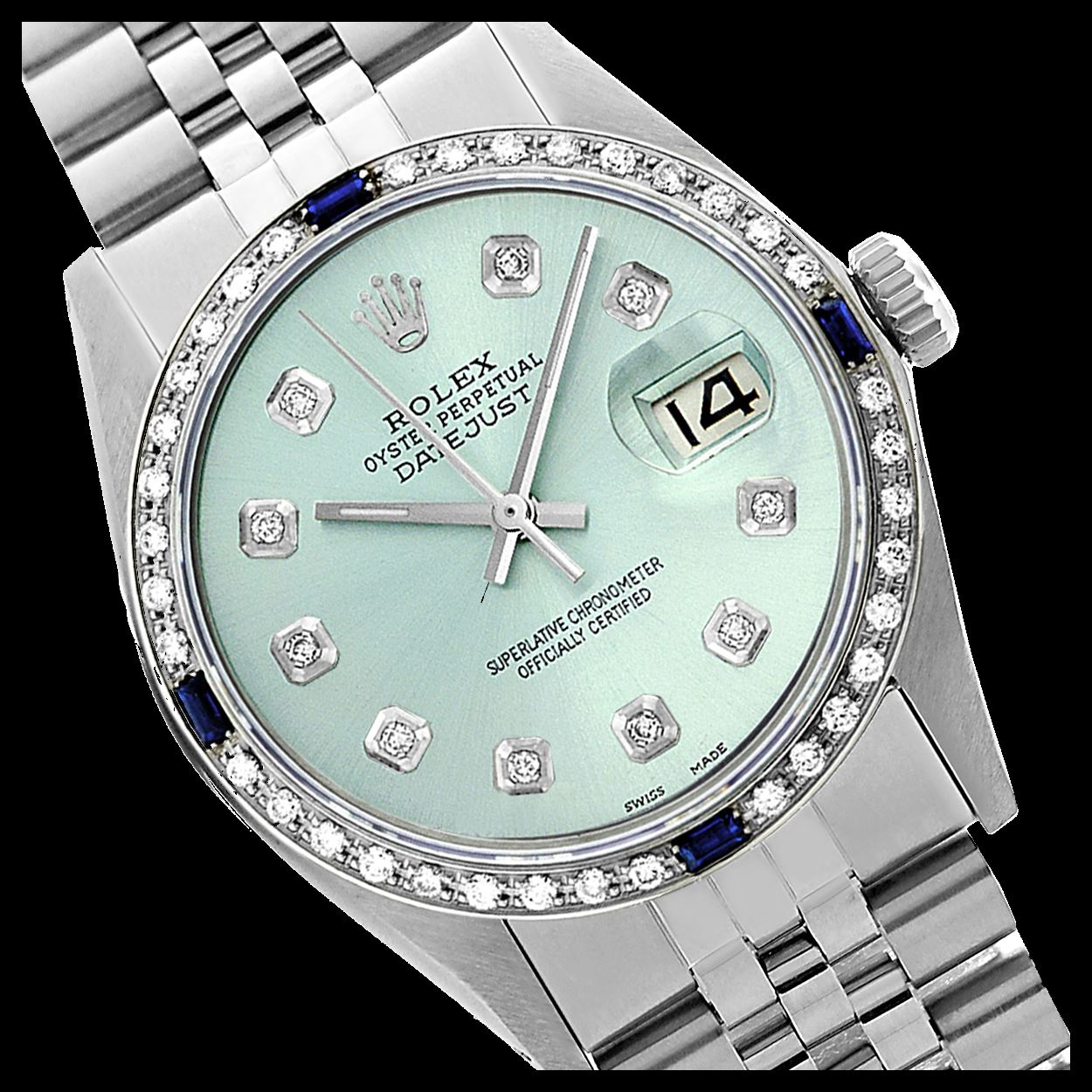 WATCH DETAILS: ITEM: WatchBRAND: RolexTYPE: Stainless SteelFEATURE: QuickSetMODEL: DateJustMADE: Swiss MadeGENDER: Men'sCONDITION: Pre-OwnedFUNCTION: DateDIAL COLOR: Ice BlueHOUR MARKERS: 10 Round Custom Made DiamondBEZEL TYPE: Custom Made Diamond & Sapphire BezelBEZEL STONE: Diamond 1 CTW G-VVS1 & Ceylon Blue SapphireBEZEL MATERIAL: 18K GoldBRACELET TYPE: Jubilee BRACELET MATERIAL: Stainless SteelCLASP TYPE: Folding ClaspCLASP MATERIAL: Stainless SteelCASE STONE: CASE SIZE: 36mmCRYSTAL: Scratch Resistance Sapphire CrystalMOVEMENT: Automatic (Self Winding)CALIBER: 3035CROWN TYPE: Screw Down CrownWATER RESISTANCE: Waterproof to 10 ATM/100 meters/330 feetMODEL #: 16014SKU #: AMSJQS37We Buy/Sell/Trade Valuable watches, Please call us