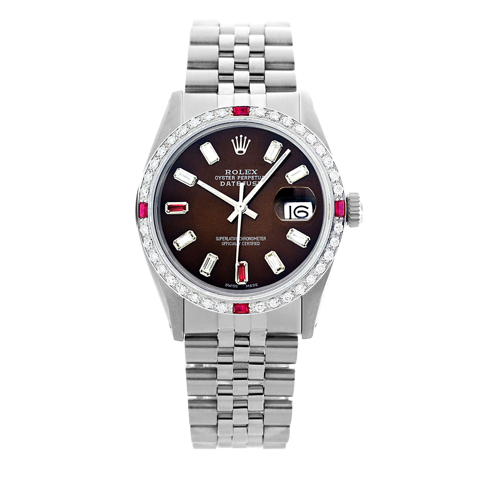 WATCH DETAILS: ITEM: WatchBRAND: RolexTYPE: Stainless SteelFEATURE: QuickSetMODEL: DateJustMADE: Swiss MadeGENDER: Men'sCONDITION: Pre-OwnedFUNCTION: DateDIAL COLOR: ChocolateHOUR MARKERS: 8 + 2 , 8 Round Custom Made Diamond & 2 Baguette RubyBEZEL TYPE: Custom Made Diamond & Ruby BezelBEZEL STONE: Diamond 1 CTW G-VVS1 & 4 Burmise RubyBEZEL MATERIAL: 18K GoldBRACELET TYPE: Jubilee BRACELET MATERIAL: Stainless SteelCLASP TYPE: Folding ClaspCLASP MATERIAL: Stainless SteelCASE STONE: CASE SIZE: 36mmCRYSTAL: Scratch Resistance Sapphire CrystalMOVEMENT: Automatic (Self Winding)CALIBER: 3035CROWN TYPE: Screw Down CrownWATER RESISTANCE: Waterproof to 10 ATM/100 meters/330 feetMODEL #: 16014SKU #: AMSJQS25We Buy/Sell/Trade Valuable watches, Please call us