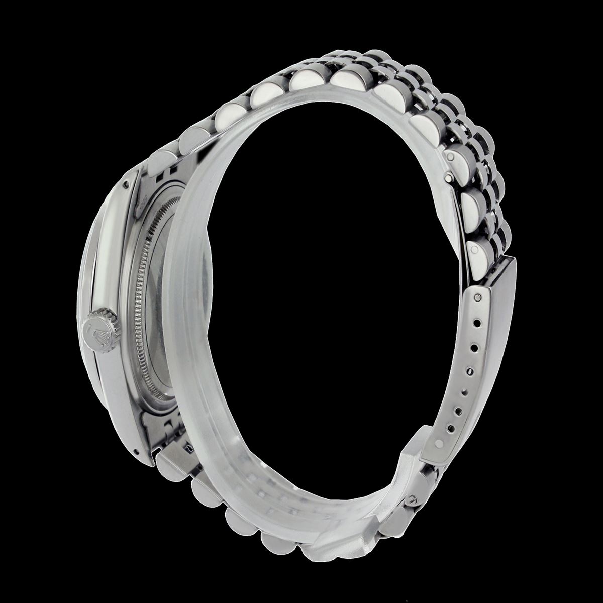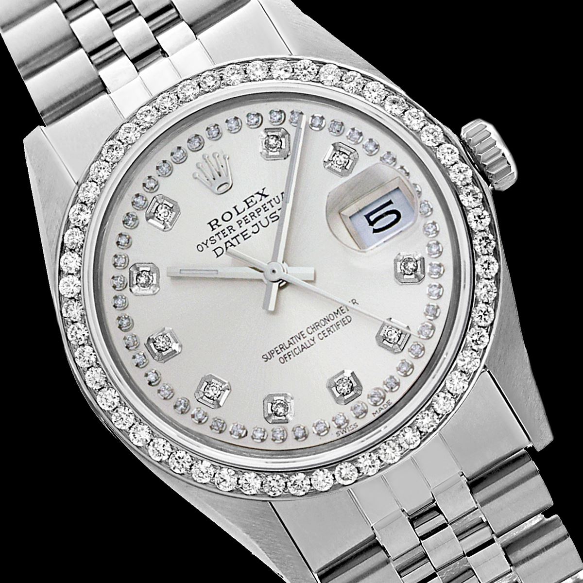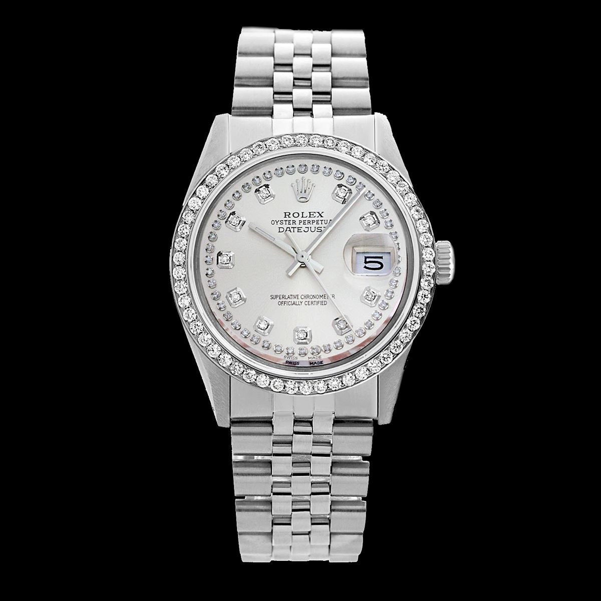 WATCH DETAILS: ITEM: WatchBRAND: RolexTYPE: Stainless SteelFEATURE: QuickSetMODEL: DateJustMADE: Swiss MadeGENDER: Men'sCONDITION: Pre-OwnedFUNCTION: DateDIAL COLOR: SilverHOUR MARKERS: String Custom Made Diamond + 10 Round Custom Made DiamondBEZEL TYPE: Custom Made Diamond BezelBEZEL STONE: Diamond 1.14 CTW G-VVS1 BEZEL MATERIAL: 18K GoldBRACELET TYPE: Jubilee BRACELET MATERIAL: Stainless SteelCLASP TYPE: Folding ClaspCLASP MATERIAL: Stainless SteelCASE STONE: CASE SIZE: 36mmCRYSTAL: Scratch Resistance Sapphire CrystalMOVEMENT: Automatic (Self Winding)CALIBER: 3035CROWN TYPE: Screw Down CrownWATER RESISTANCE: Waterproof to 10 ATM/100 meters/330 feetMODEL #: 16014SKU #: AMSJQS63We Buy/Sell/Trade Valuable watches, Please call us