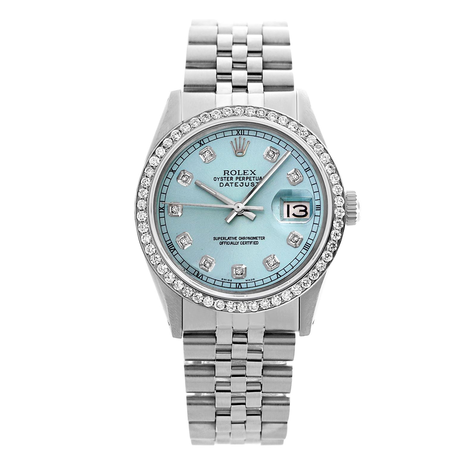 WATCH DETAILS: ITEM: WatchBRAND: RolexTYPE: Stainless SteelFEATURE: QuickSetMODEL: DateJustMADE: Swiss MadeGENDER: Men'sCONDITION: Pre-OwnedFUNCTION: DateDIAL COLOR: Ice BlueHOUR MARKERS: 10 Round Custom Made DiamondBEZEL TYPE: Custom Made Diamond BezelBEZEL STONE: Diamond 1.14 CTW G-VVS1 BEZEL MATERIAL: 18K GoldBRACELET TYPE: Jubilee BRACELET MATERIAL: Stainless SteelCLASP TYPE: Folding ClaspCLASP MATERIAL: Stainless SteelCASE STONE: CASE SIZE: 36mmCRYSTAL: Scratch Resistance Sapphire CrystalMOVEMENT: Automatic (Self Winding)CALIBER: 3035CROWN TYPE: Screw Down CrownWATER RESISTANCE: Waterproof to 10 ATM/100 meters/330 feetMODEL #: 16014SKU #: AMSJQS19We Buy/Sell/Trade Valuable watches, Please call us