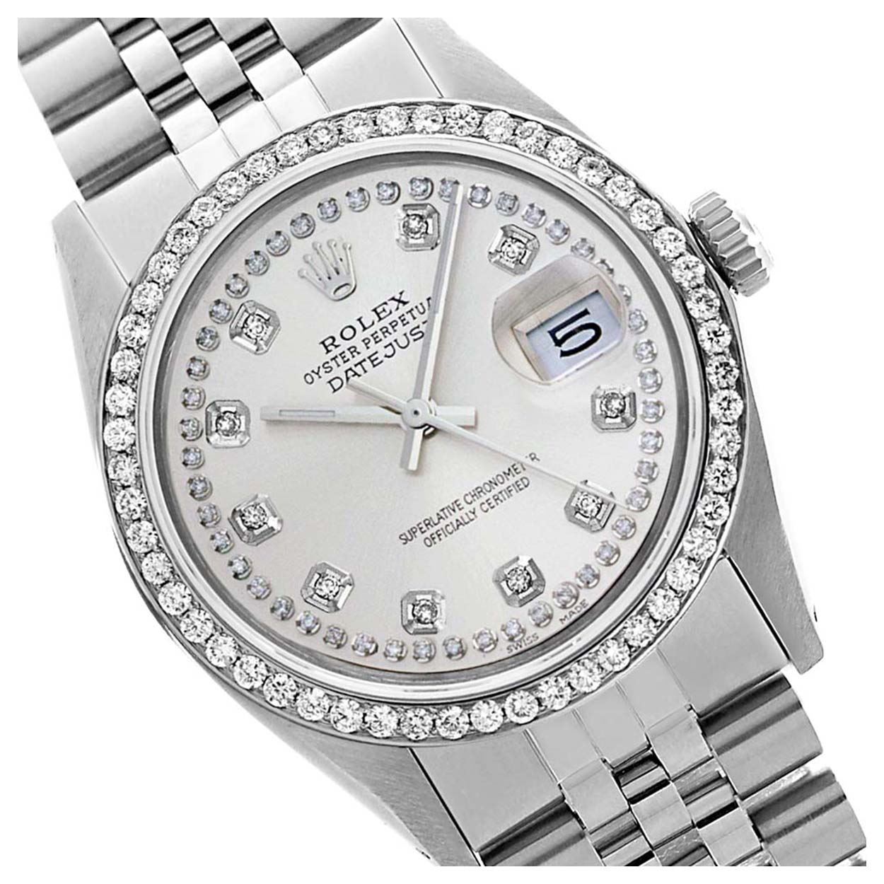 WATCH DETAILS: ITEM: WatchBRAND: RolexTYPE: Stainless SteelFEATURE: QuickSetMODEL: DateJustMADE: Swiss MadeGENDER: Men'sCONDITION: Pre-OwnedFUNCTION: DateDIAL COLOR: WhiteHOUR MARKERS: String Custom Made Diamond + 10 Round Custom Made DiamondBEZEL TYPE: Custom Made Diamond BezelBEZEL STONE: Diamond 1.14 CTW G-VVS1 BEZEL MATERIAL: 18K GoldBRACELET TYPE: Jubilee BRACELET MATERIAL: Stainless SteelCLASP TYPE: Folding ClaspCLASP MATERIAL: Stainless SteelCASE STONE: CASE SIZE: 36mmCRYSTAL: Scratch Resistance Sapphire CrystalMOVEMENT: Automatic (Self Winding)CALIBER: 3035CROWN TYPE: Screw Down CrownWATER RESISTANCE: Waterproof to 10 ATM/100 meters/330 feetMODEL #: 16014SKU #: AMSJQS36We Buy/Sell/Trade Valuable watches, Please call us