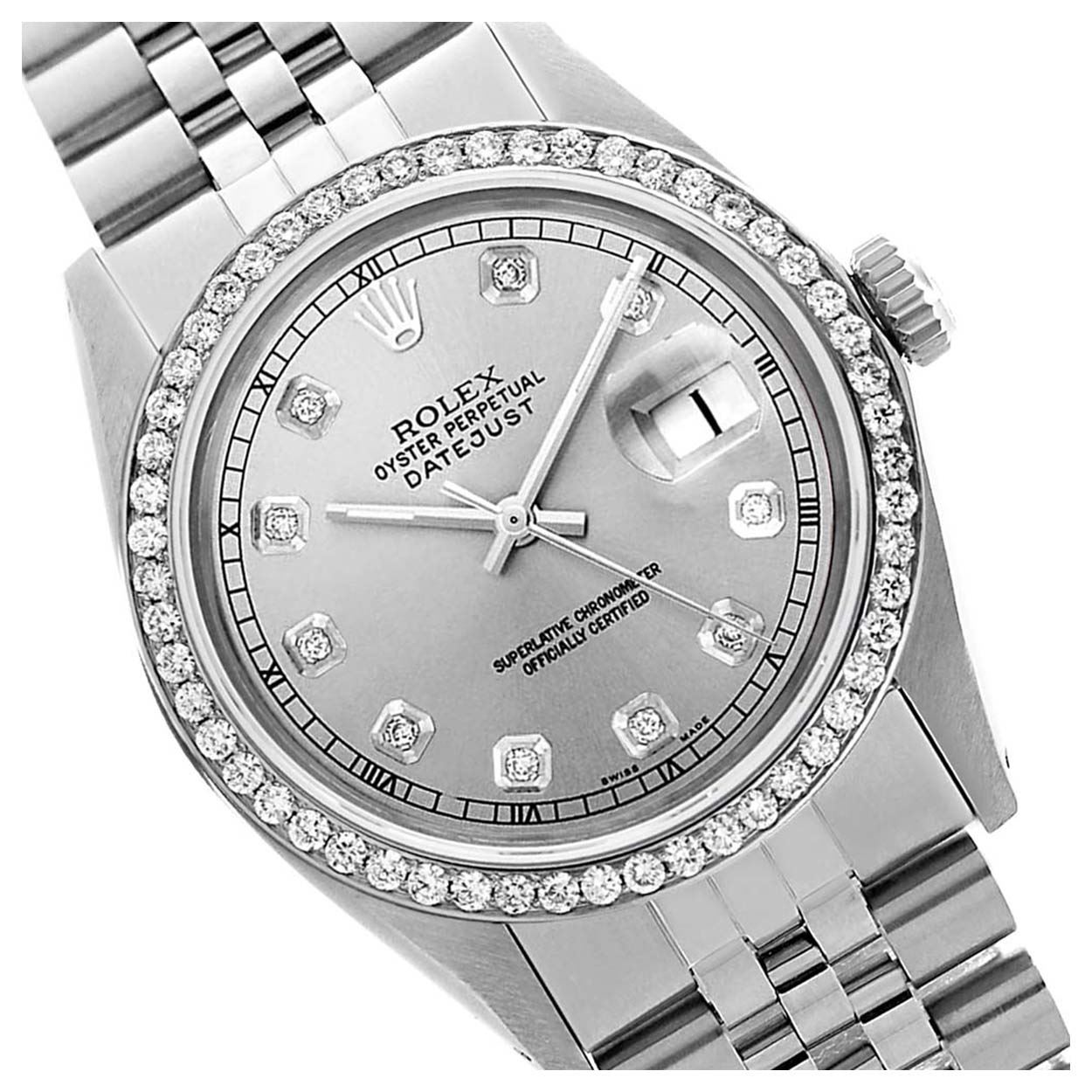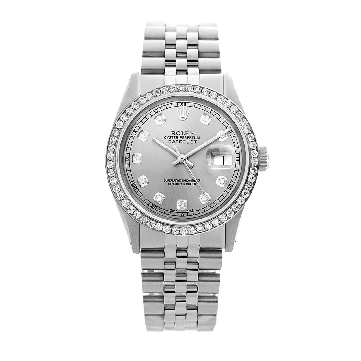 WATCH DETAILS: ITEM: WatchBRAND: RolexTYPE: Stainless SteelFEATURE: QuickSetMODEL: DateJustMADE: Swiss MadeGENDER: Men'sCONDITION: Pre-OwnedFUNCTION: DateDIAL COLOR: GreyHOUR MARKERS: 10 Round Custom Made DiamondBEZEL TYPE: Custom Made Diamond BezelBEZEL STONE: Diamond 1.14 CTW G-VVS1 BEZEL MATERIAL: 18K GoldBRACELET TYPE: Jubilee BRACELET MATERIAL: Stainless SteelCLASP TYPE: Folding ClaspCLASP MATERIAL: Stainless SteelCASE STONE: CASE SIZE: 36mmCRYSTAL: Scratch Resistance Sapphire CrystalMOVEMENT: Automatic (Self Winding)CALIBER: 3035CROWN TYPE: Screw Down CrownWATER RESISTANCE: Waterproof to 10 ATM/100 meters/330 feetMODEL #: 16014SKU #: AMSJQS22We Buy/Sell/Trade Valuable watches, Please call us