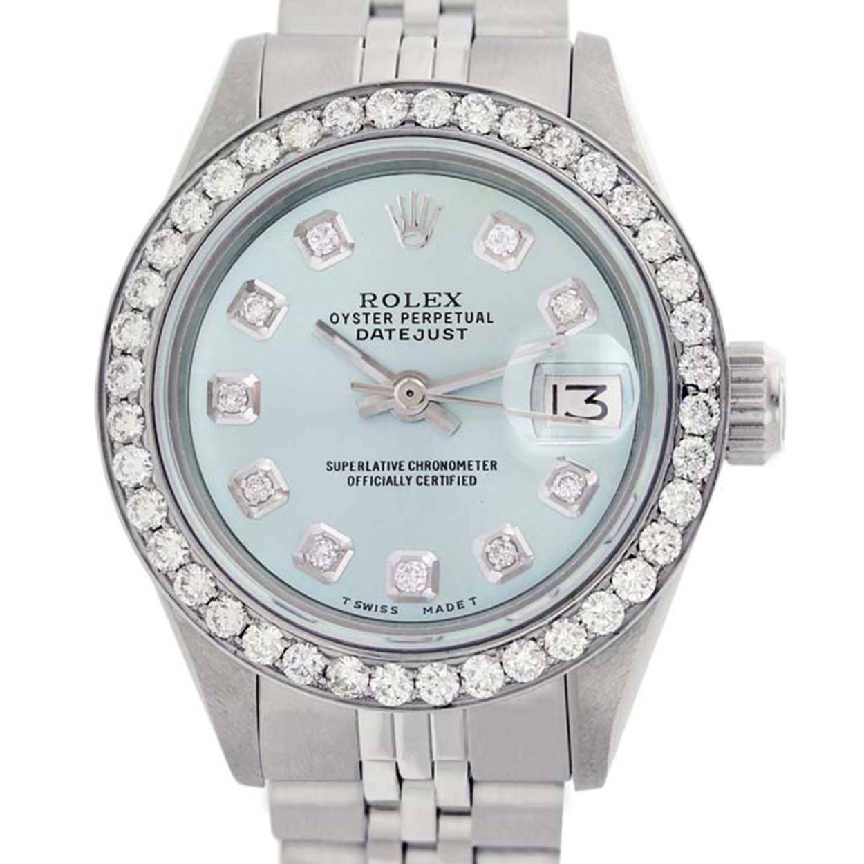 WATCH DETAILS: ITEM: WatchBRAND: RolexTYPE: Stainless SteelFEATURE: QuickSetMODEL: DateJustMADE: Swiss MadeGENDER: Men'sCONDITION: Pre-OwnedFUNCTION: DateDIAL COLOR: BlueHOUR MARKERS: 10 Round Custom Made DiamondBEZEL TYPE: Custom Made Diamond BezelBEZEL STONE: Diamond 1.14 CTW G-VVS1 BEZEL MATERIAL: 18K GoldBRACELET TYPE: Jubilee BRACELET MATERIAL: Stainless SteelCLASP TYPE: Folding ClaspCLASP MATERIAL: Stainless SteelCASE STONE: CASE SIZE: 36mmCRYSTAL: Scratch Resistance Sapphire CrystalMOVEMENT: Automatic (Self Winding)CALIBER: 3035CROWN TYPE: Screw Down CrownWATER RESISTANCE: Waterproof to 10 ATM/100 meters/330 feetMODEL #: 16014SKU #: AMSJQS93We Buy/Sell/Trade Valuable watches, Please call us