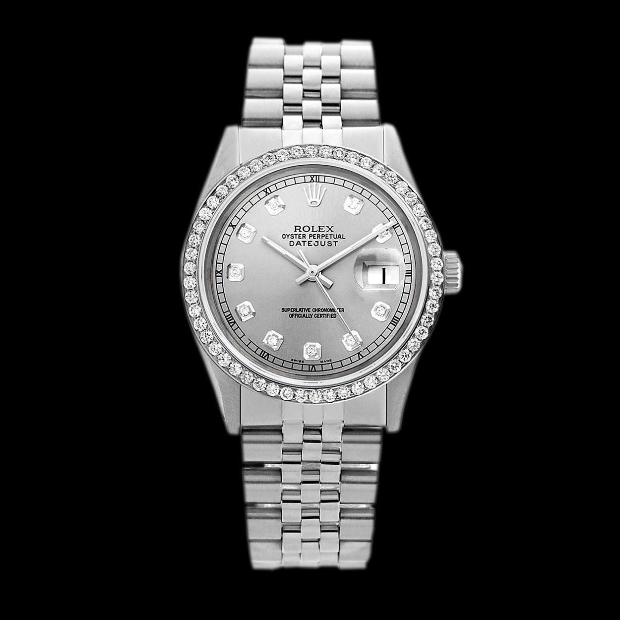 WATCH DETAILS: ITEM: WatchBRAND: RolexTYPE: Stainless SteelFEATURE: QuickSetMODEL: DateJustMADE: Swiss MadeGENDER: Men'sCONDITION: Pre-OwnedFUNCTION: DateDIAL COLOR: GreyHOUR MARKERS: 10 Round Custom Made DiamondBEZEL TYPE: Custom Made Diamond BezelBEZEL STONE: Diamond 1.14 CTW G-VVS1 BEZEL MATERIAL: 18K GoldBRACELET TYPE: Jubilee BRACELET MATERIAL: Stainless SteelCLASP TYPE: Folding ClaspCLASP MATERIAL: Stainless SteelCASE STONE: CASE SIZE: 36mmCRYSTAL: Scratch Resistance Sapphire CrystalMOVEMENT: Automatic (Self Winding)CALIBER: 3035CROWN TYPE: Screw Down CrownWATER RESISTANCE: Waterproof to 10 ATM/100 meters/330 feetMODEL #: 16014SKU #: AMSJQS22We Buy/Sell/Trade Valuable watches, Please call us