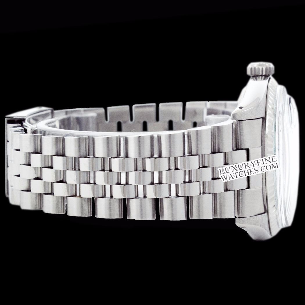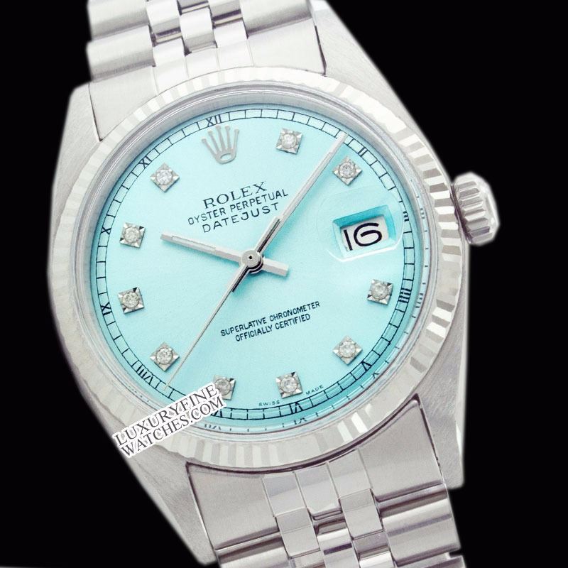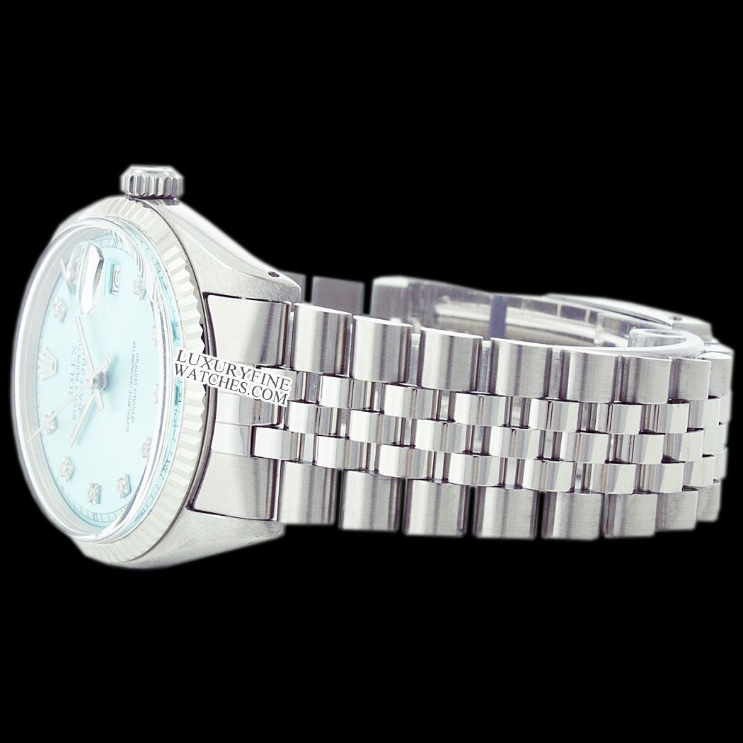 WATCH DETAILS: ITEM: WatchBRAND: RolexTYPE: Stainless SteelFEATURE: QuickSetMODEL: DateJustMADE: Swiss MadeGENDER: Men'sCONDITION: Pre-OwnedFUNCTION: DateDIAL COLOR: Ice BlueHOUR MARKERS: 10 Round DiamondBEZEL TYPE: Fluted BezelBEZEL STONE: No StoneBEZEL MATERIAL: 18K GoldBRACELET TYPE: Jubilee BRACELET MATERIAL: Stainless SteelCLASP TYPE: Folding ClaspCLASP MATERIAL: Stainless SteelCASE STONE: CASE SIZE: 36mmCRYSTAL: Acrylic MOVEMENT: Automatic (Self Winding)CALIBER: 3035CROWN TYPE: Screw Down CrownWATER RESISTANCE: Waterproof to 10 ATM/100 meters/330 feetMODEL #: 16014SKU #: AMSJQP88We Buy/Sell/Trade Valuable watches, Please call usNote: Presentational generic box included. This watch was professionally inspected and serviced prior to auction. We are not affiliated with Rolex USA, Inc.