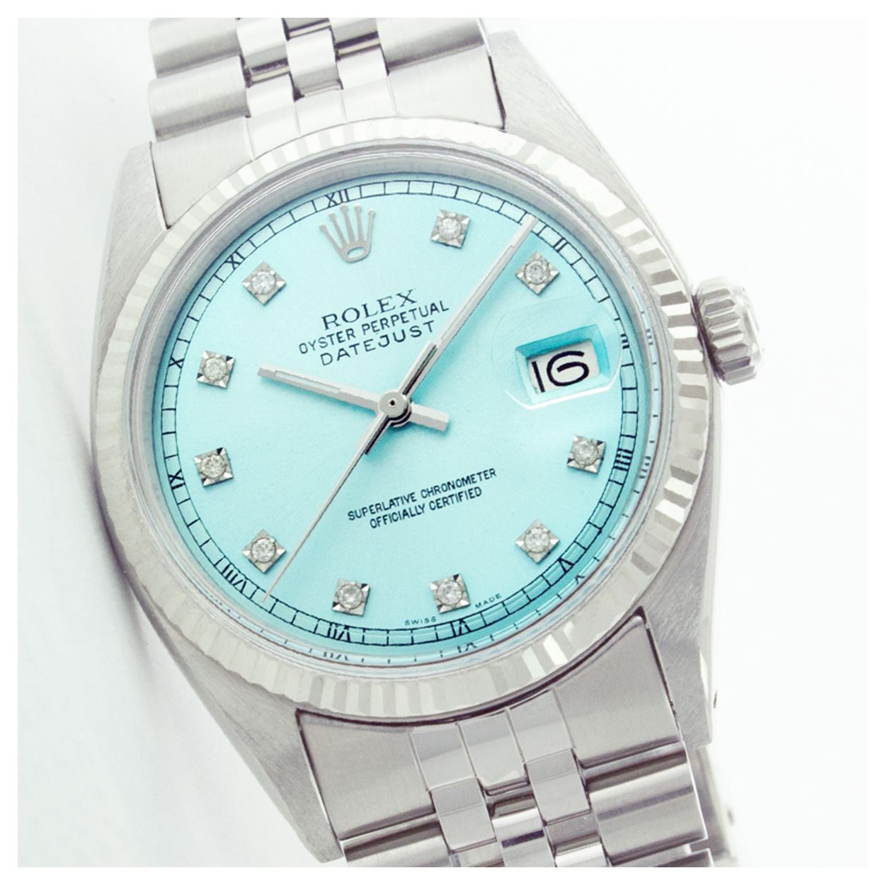 WATCH DETAILS: ITEM: WatchBRAND: RolexTYPE: Stainless SteelFEATURE: QuickSetMODEL: DateJustMADE: Swiss MadeGENDER: Men'sCONDITION: Pre-OwnedFUNCTION: DateDIAL COLOR: Ice BlueHOUR MARKERS: 10 Round Custom Made DiamondBEZEL TYPE: Fluted BezelBEZEL STONE: No StoneBEZEL MATERIAL: 18K GoldBRACELET TYPE: Jubilee BRACELET MATERIAL: Stainless SteelCLASP TYPE: Folding ClaspCLASP MATERIAL: Stainless SteelCASE STONE: CASE SIZE: 36mmCRYSTAL: Acrylic MOVEMENT: Automatic (Self Winding)CALIBER: 3035CROWN TYPE: Screw Down CrownWATER RESISTANCE: Waterproof to 10 ATM/100 meters/330 feetMODEL #: 16014SKU #: AMSJQP88We Buy/Sell/Trade Valuable watches, Please call us